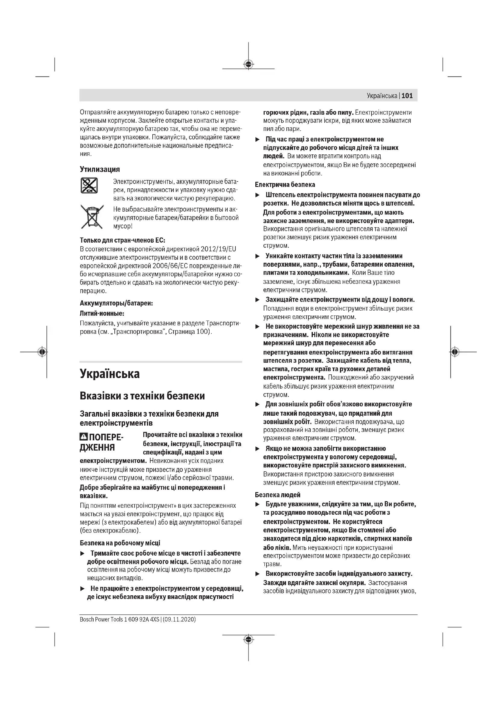 1 609 92A 4XS | (09.11.2020) Bosch Power ToolsҚазақ | 107 Лише для країнЄС: Відповідно до європейської директиви 2012/19/EU електроінструменти, що вийшли із вживання, та відповідно до європейської директиви 2006/66/EC пошкоджені або відпрацьовані акумуляторні батареї/ батарейки повинні здаватися окремо і утилізуватися екологічно чистим способом. Акумулятори/батарейки: Літієво-іонні: Будь ласка, зважайте на вказівки в розділі Транспортування (див. „Транспортування“, Сторінка106).