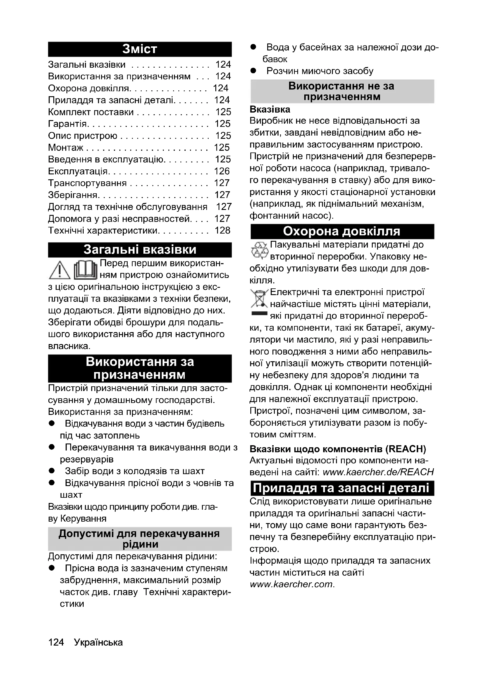 - Інформація щодо приладдя та запасних частин міститься на сайті www.kaercher.com. Загальні вказівки p. 124