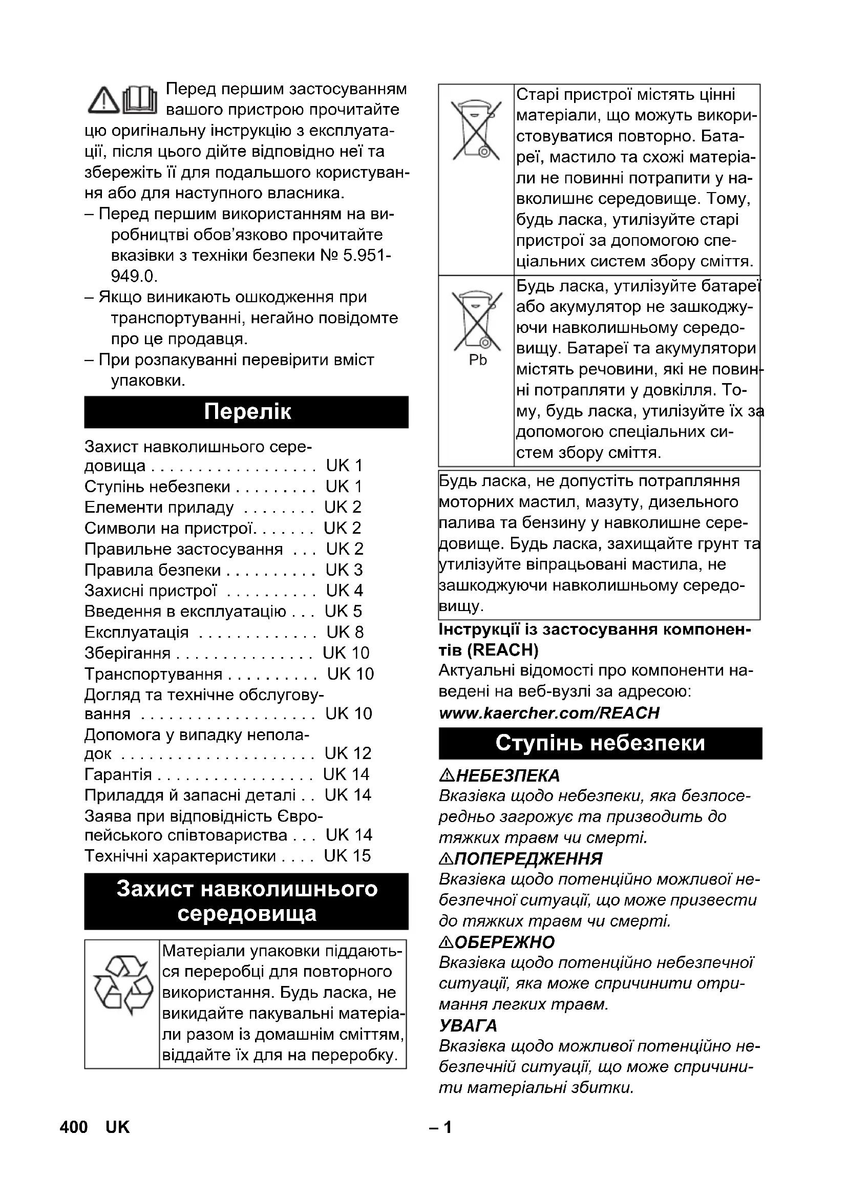 Захист навколишнього сере- довища . . . . . . . . . . . . . . . . . . UK 1 Ступінь небезпеки . . . . . . . . . UK 1 Елементи приладу . . . . . . . . UK 2 Символи на пристрої. . . . . . . UK 2 Правильне застосування . . . UK 2 Правила безпеки . . . . . . . . . . UK 3 Захисні пристрої . . . . . . . . . . UK 4 Введення в експлуатацію . . . UK 5 Експлуатація . . . . . . . . . . . . . UK 8 Зберігання . . . . . . . . . . . . . . . UK 10 Транспортування . . . . . . . . . . UK 10 Догляд та технічне обслугову- вання . . . . . . . . . . . . . . . . . . . UK 10 Допомога у випадку непола- док . . . . . . . . . . . . . . . . . . . . . UK 12 Гарантія . . . . . . . . . . . . . . . . . UK 14 Приладдя й запасні деталі . . UK 14 Заява при відповідність Євро- пейського співтовариства . . . UK 14 Технічні характеристики . . . . UK 15 Захист навколишнього