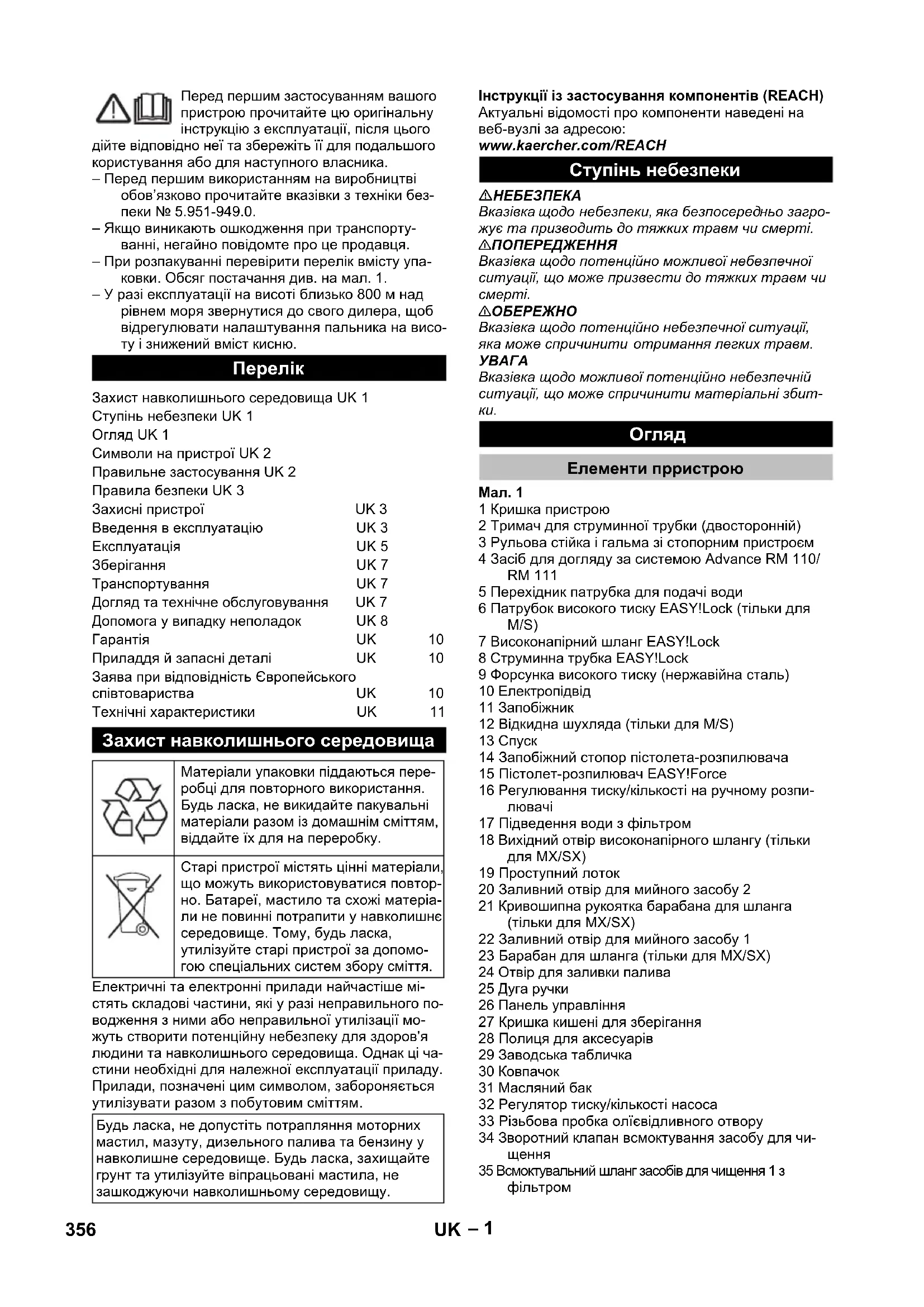 1,0 1,0 Eksploatacinės medžiagos Degalai -- Mazutas EL arba dy- zelinas Mazutas EL arba dy- zelinas Alyvos kiekis l 1,0 1,0 Alyvos rūšis -- SAE 90 SAE 90 Matmenys ir masė Ilgis x plotis x aukštis mm 1 330 × 750 × 1060 1 330 × 750 × 1060 Tipinė eksploatacinė masė, S kg 200 200 Tipinė eksploatacinė masė, SX kg 205 205 Degalų bakas l 25 25 Valymo priemonių bakas l 10+20 10+20 355LT– 1 Перед першим застосуванням вашого пристрою прочитайте цю оригінальну інструкцію з експлуатації, після цього дійте відповідно неї та збережіть її для подальшого користування або для наступного власника. – Перед першим використанням на виробництві обов’язково прочитайте вказівки з техніки без- пеки № 5.951-949.0. – Якщо виникають ошкодження при транспорту- ванні, негайно повідомте про це продавця. – При розпакуванні перевірити перелік вмісту упа- ковки. Обсяг постачання див. на мал. 1. – У разі експлуатації на висоті близько 800 м над рівнем моря звернутися до свого дилера, щоб відрегулювати налаштування пальника на висо- ту і знижений вміст кисню. Електричні та електронні прилади найчастіше мі- стять складові частини, які у разі неправильного по- водження з ними або неправильної утилізації мо- жуть створити потенційну небезпеку для здоров'я людини та навколишнього середовища. Однак ці ча- стини необхідні для належної експлуатації приладу. Прилади, позначені цим символом, забороняється утилізувати разом з побутовим сміттям. Інструкції із застосування компонентів (REACH) Актуальні відомості про компоненти наведені на веб-вузлі за адресою: www.kaercher.com/REACH