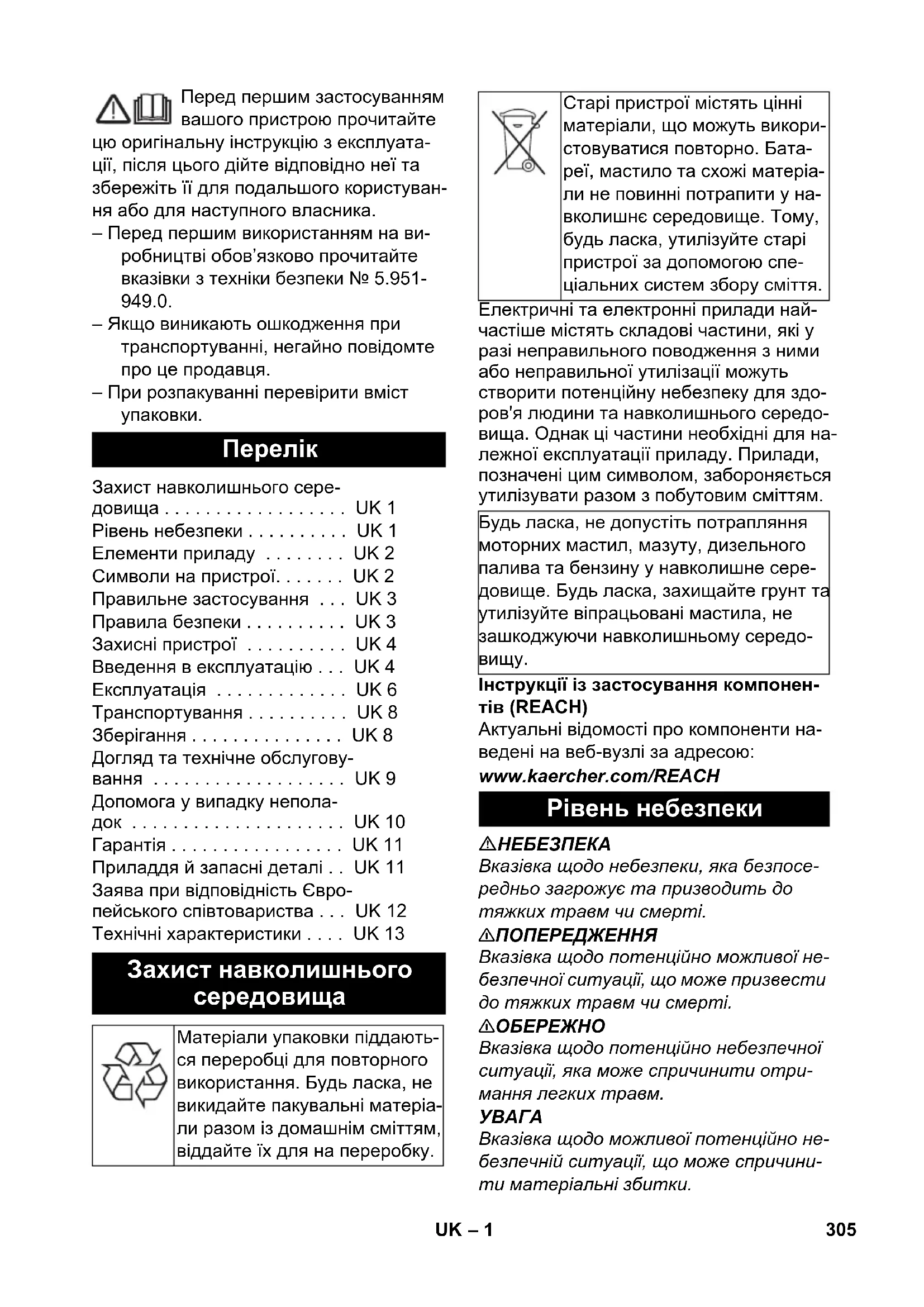 Електричні та електронні прилади най- частіше містять складові частини, які у разі неправильного поводження з ними або неправильної утилізації можуть створити потенційну небезпеку для здо- ров'я людини та навколишнього середо- вища. Однак ці частини необхідні для на- лежної експлуатації приладу. Прилади, позначені цим символом, забороняється утилізувати разом з побутовим сміттям. Інструкції із застосування компонен- тів (REACH) Актуальні відомості про компоненти на- ведені на веб-вузлі за адресою: www.kaercher.com/REACH