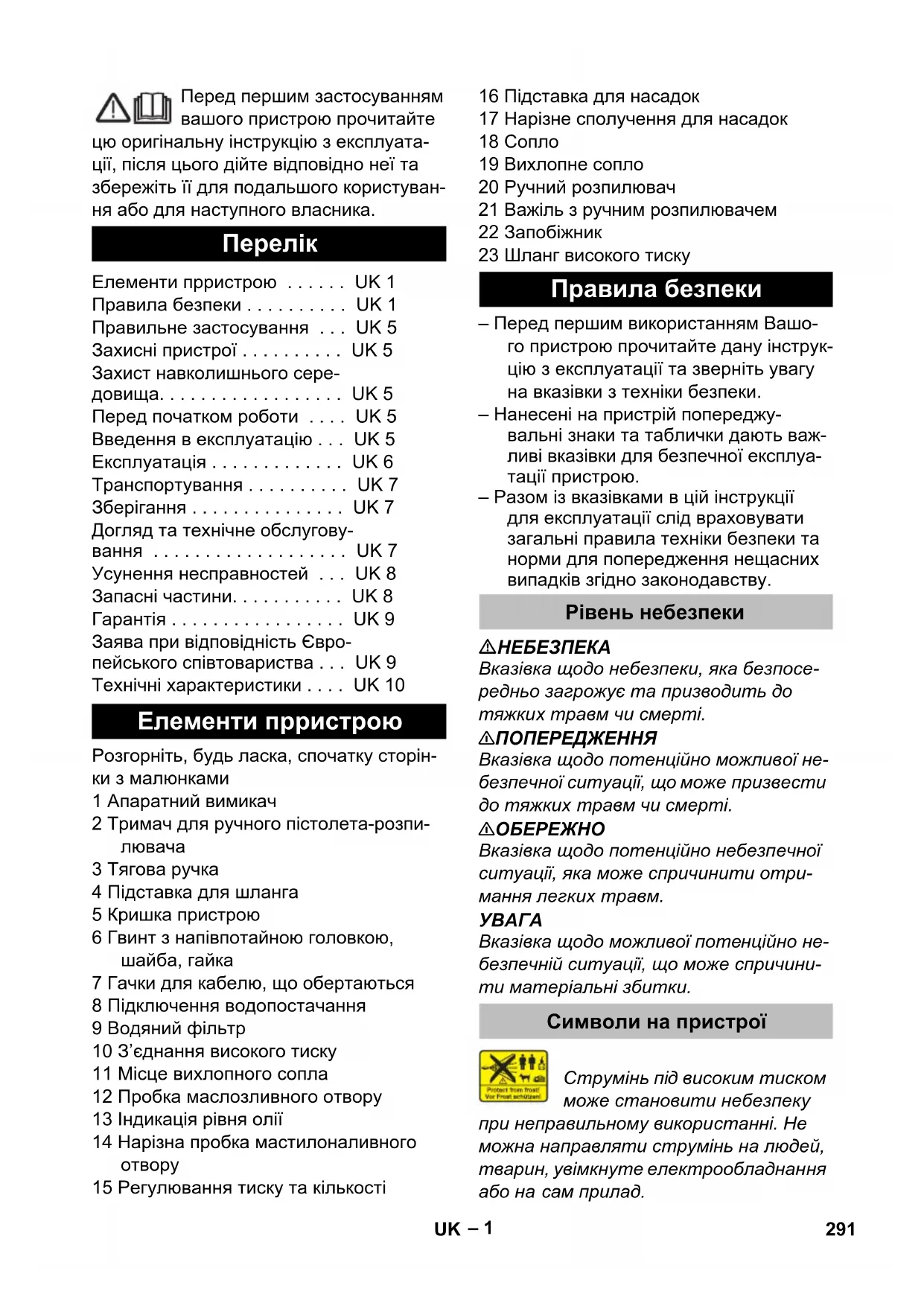 Елементи прристрою . . . . . . UK 1 Правила безпеки . . . . . . . . . . UK 1 Правильне застосування . . . UK 5 Захисні пристрої . . . . . . . . . . UK 5 Захист навколишнього сере- довища. . . . . . . . . . . . . . . . . . UK 5 Перед початком роботи . . . . UK 5 Введення в експлуатацію . . . UK 5 Експлуатація . . . . . . . . . . . . . UK 6 Транспортування . . . . . . . . . . UK 7 Зберігання . . . . . . . . . . . . . . . UK 7 Догляд та технічне обслугову- вання . . . . . . . . . . . . . . . . . . . UK 7 Усунення несправностей . . . UK 8 Запасні частини. . . . . . . . . . . UK 8 Гарантія . . . . . . . . . . . . . . . . . UK 9 Заява при відповідність Євро- пейського співтовариства . . . UK 9 Технічні характеристики . . . . UK 10 Елементи прристрою Правила безпеки Рівень небезпеки Символи на пристрої 291UK– 2 Відповідно до діючих директив забороняється експлуатація приладу без сепаратору си- стем у системі водопостачання питної води. Слід використовувати відповід- ний сепаратор систем фірми Kaercher або альтернативний сепаратор си- стем, згідно EN 12729 типу BA. Вода, що пройшла через системний се- паратор, вважається непридатною