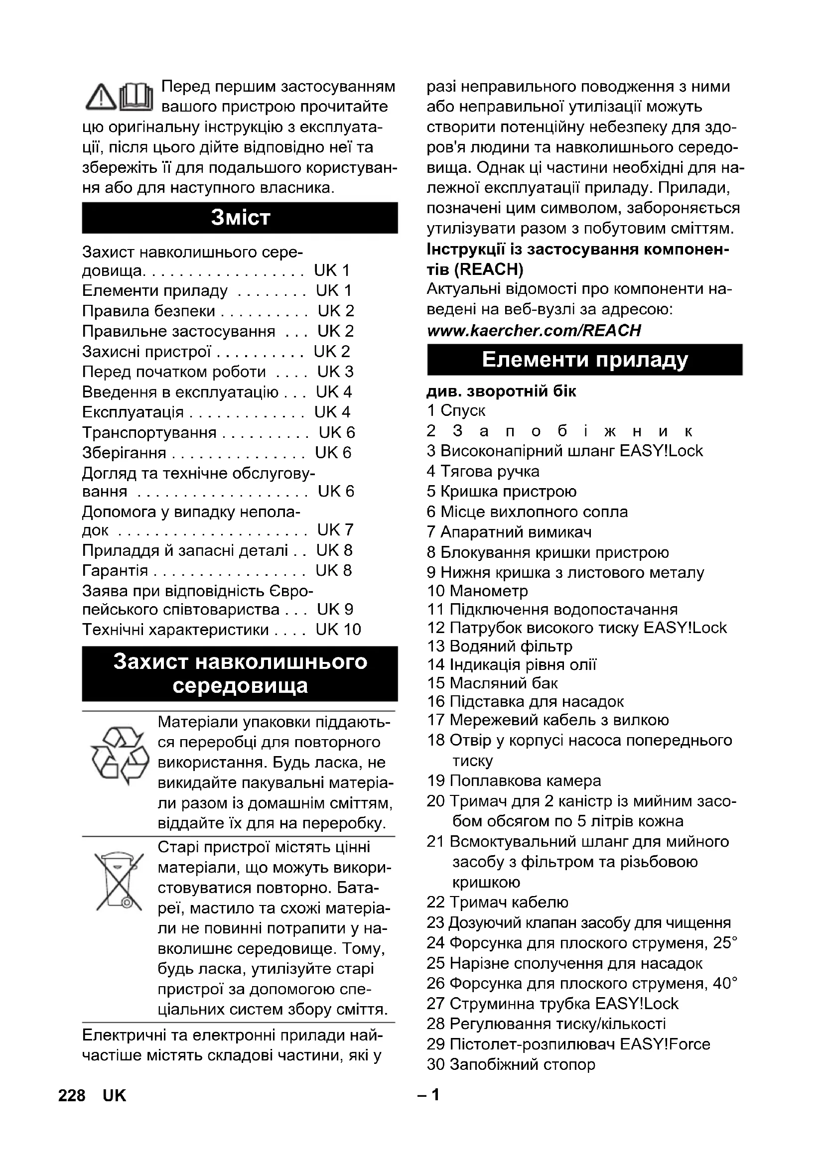 Матеріали упаковки піддають- ся переробці для повторного використання. Будь ласка, не викидайте пакувальні матеріа- ли разом із домашнім сміттям, віддайте їх для на переробку. Старі пристрої містять цінні матеріали, що можуть викори- стовуватися повторно. Бата- реї, мастило та схожі матеріа- ли не повинні потрапити у на- вколишнє середовище. Тому, будь ласка, утилізуйте старі пристрої за допомогою спе- ціальних систем збору сміття. Елементи приладу 228 UK– 2 – Органи управління для процесу чи- щення є жовтими. – Органи управління для технічного об- слуговування та сервісу є світло-сіри-