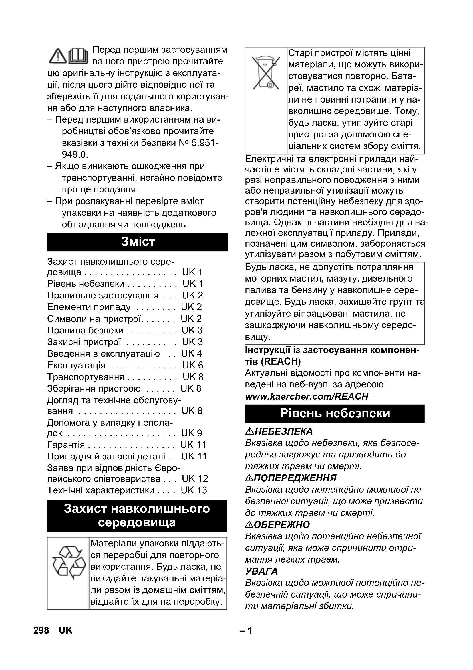 – Якщо виникають ошкодження при транспортуванні, негайно повідомте про це продавця. – При розпакуванні перевірте вміст упаковки на наявність додаткового обладнання чи пошкоджень. Електричні та електронні прилади най- частіше містять складові частини, які у разі неправильного поводження з ними або неправильної утилізації можуть створити потенційну небезпеку для здо- ров'я людини та навколишнього середо- вища. Однак ці частини необхідні для на- лежної експлуатації приладу. Прилади, позначені цим символом, забороняється утилізувати разом з побутовим сміттям. Інструкції із застосування компонен- тів (REACH) Актуальні відомості про компоненти на- ведені на веб-вузлі за адресою: www.kaercher.com/REACH