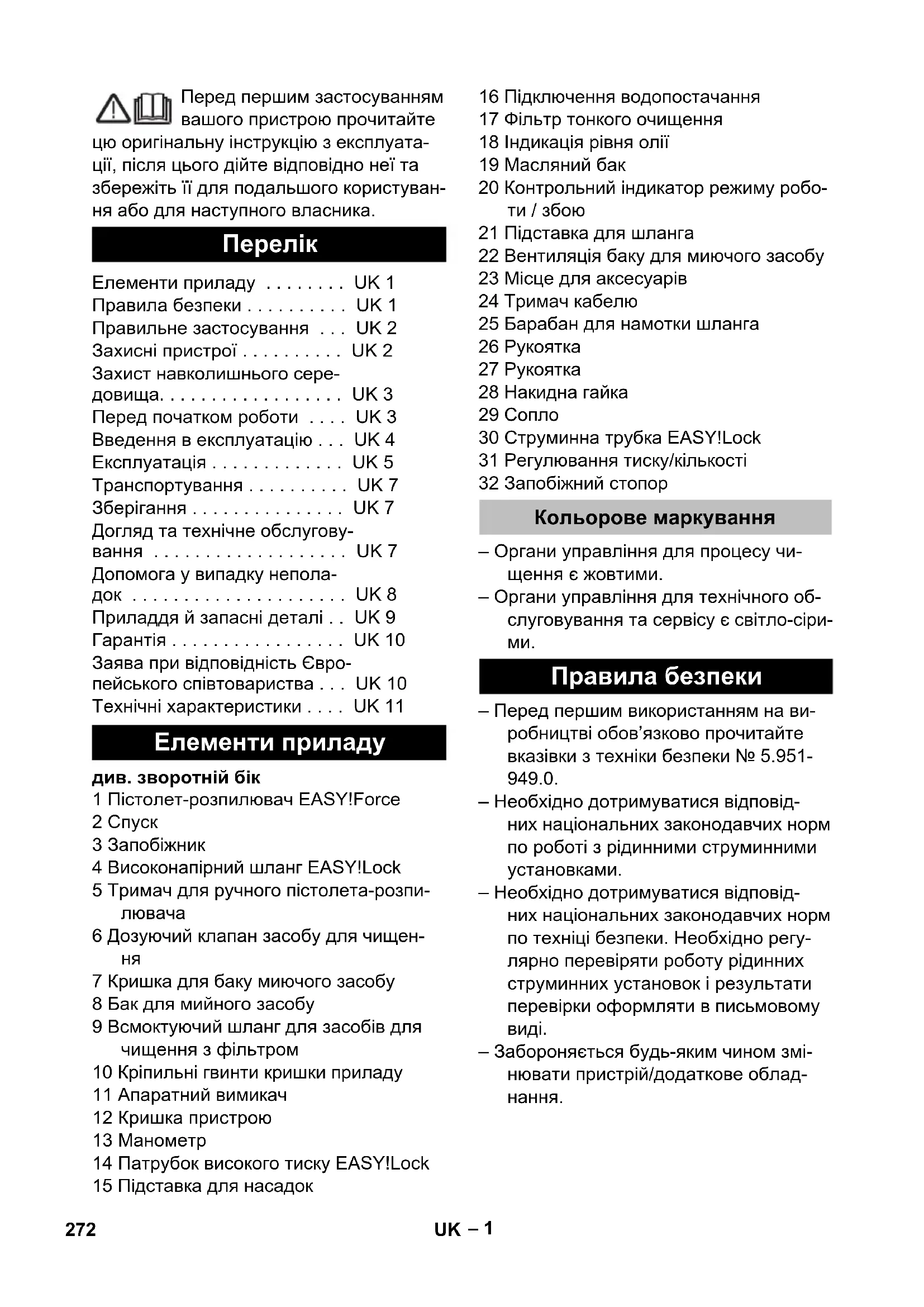 Елементи приладу . . . . . . . . UK 1 Правила безпеки . . . . . . . . . . UK 1 Правильне застосування . . . UK 2 Захисні пристрої . . . . . . . . . . UK 2 Захист навколишнього сере- довища. . . . . . . . . . . . . . . . . . UK 3 Перед початком роботи . . . . UK 3 Введення в експлуатацію . . . UK 4 Експлуатація . . . . . . . . . . . . . UK 5 Транспортування . . . . . . . . . . UK 7 Зберігання . . . . . . . . . . . . . . . UK 7 Догляд та технічне обслугову- вання . . . . . . . . . . . . . . . . . . . UK 7 Допомога у випадку непола- док . . . . . . . . . . . . . . . . . . . . . UK 8 Приладдя й запасні деталі . . UK 9 Гарантія . . . . . . . . . . . . . . . . . UK 10 Заява при відповідність Євро- пейського співтовариства . . . UK 10 Технічні характеристики . . . . UK 11 Елементи приладу Кольорове маркування Правила безпеки 272 UK– 2