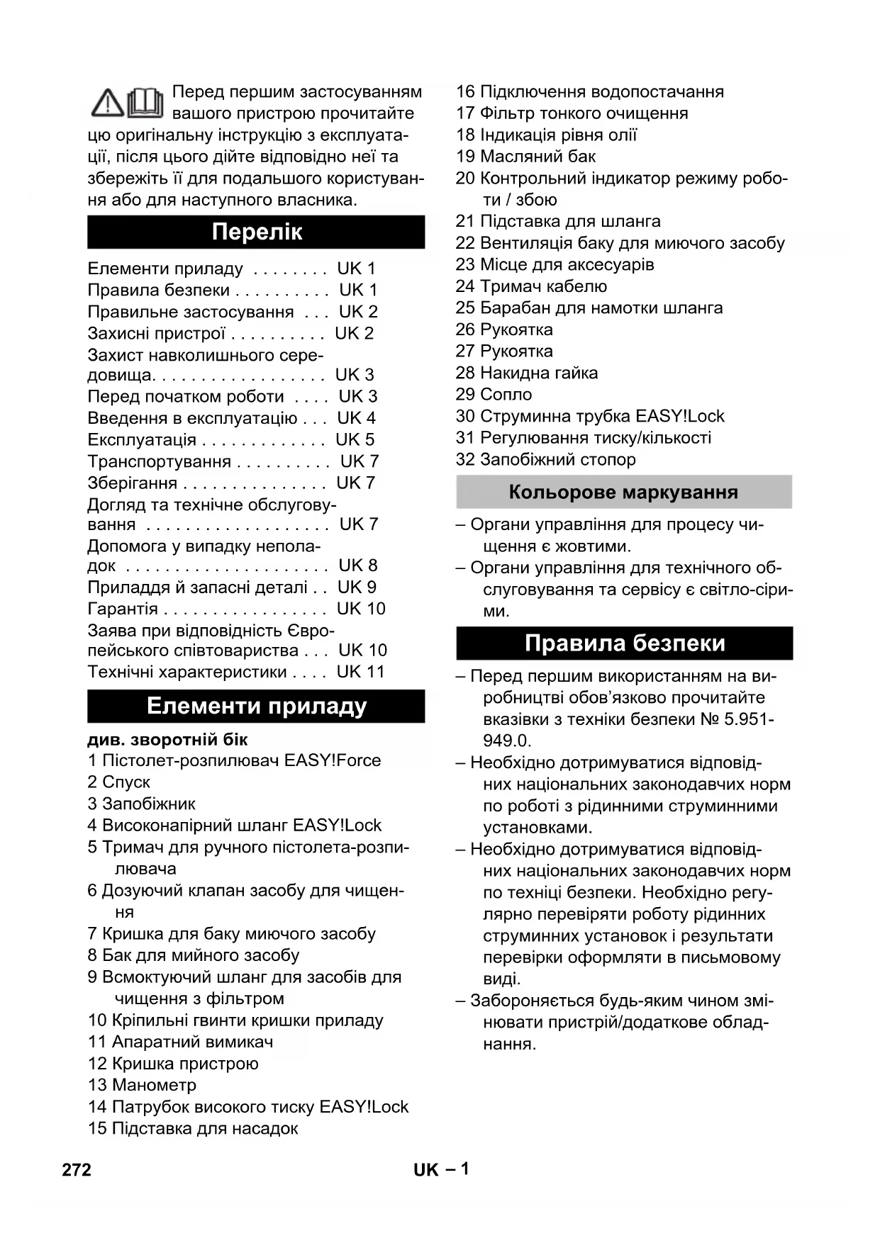 Елементи приладу . . . . . . . . UK 1 Правила безпеки . . . . . . . . . . UK 1 Правильне застосування . . . UK 2 Захисні пристрої . . . . . . . . . . UK 2 Захист навколишнього сере- довища. . . . . . . . . . . . . . . . . . UK 3 Перед початком роботи . . . . UK 3 Введення в експлуатацію . . . UK 4 Експлуатація . . . . . . . . . . . . . UK 5 Транспортування . . . . . . . . . . UK 7 Зберігання . . . . . . . . . . . . . . . UK 7 Догляд та технічне обслугову- вання . . . . . . . . . . . . . . . . . . . UK 7 Допомога у випадку непола- док . . . . . . . . . . . . . . . . . . . . . UK 8 Приладдя й запасні деталі . . UK 9 Гарантія . . . . . . . . . . . . . . . . . UK 10 Заява при відповідність Євро- пейського співтовариства . . . UK 10 Технічні характеристики . . . . UK 11 Елементи приладу Кольорове маркування Правила безпеки 272 UK– 2