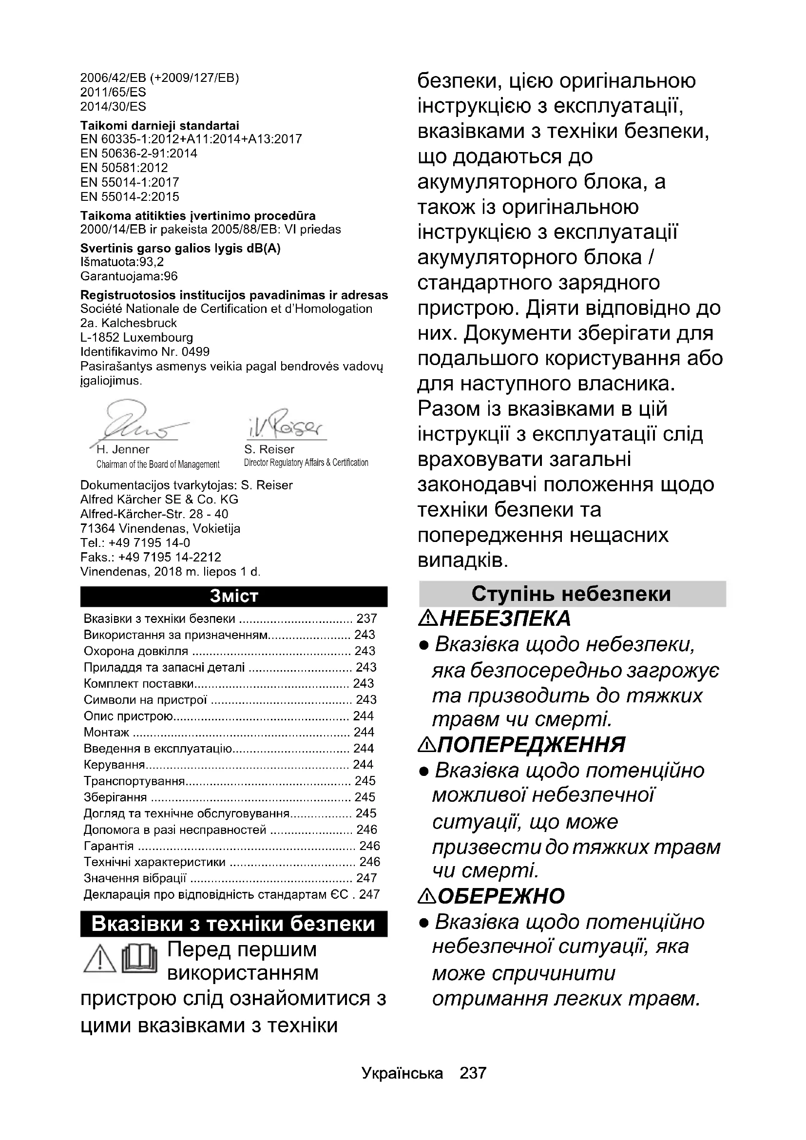 Рівень звукової потужності, дБ(A) Виміряний:93,2 Гарантований:96 Назва та адреса задіяного уповноваженого органу з сертифікації Société Nationale de Certification et d’Homologation 2a. Kalchesbruck L-1852 Luxembourg Iдентиф. ном. 0499 Особи, що нижче підписалися, діють від імені та за довіреністю керівництва. Особа, відповідальна за ведення документації: Ш. Райзер (S. Reiser) Alfred Kärcher SE & Co. KG Alfred-Kärcher-Str. 28 - 40 71364 Winnenden (Germany) Тел.: +49 7195 14-0 Факс: +49 7195 14-2212 м. Вінненден, 01.07.2018