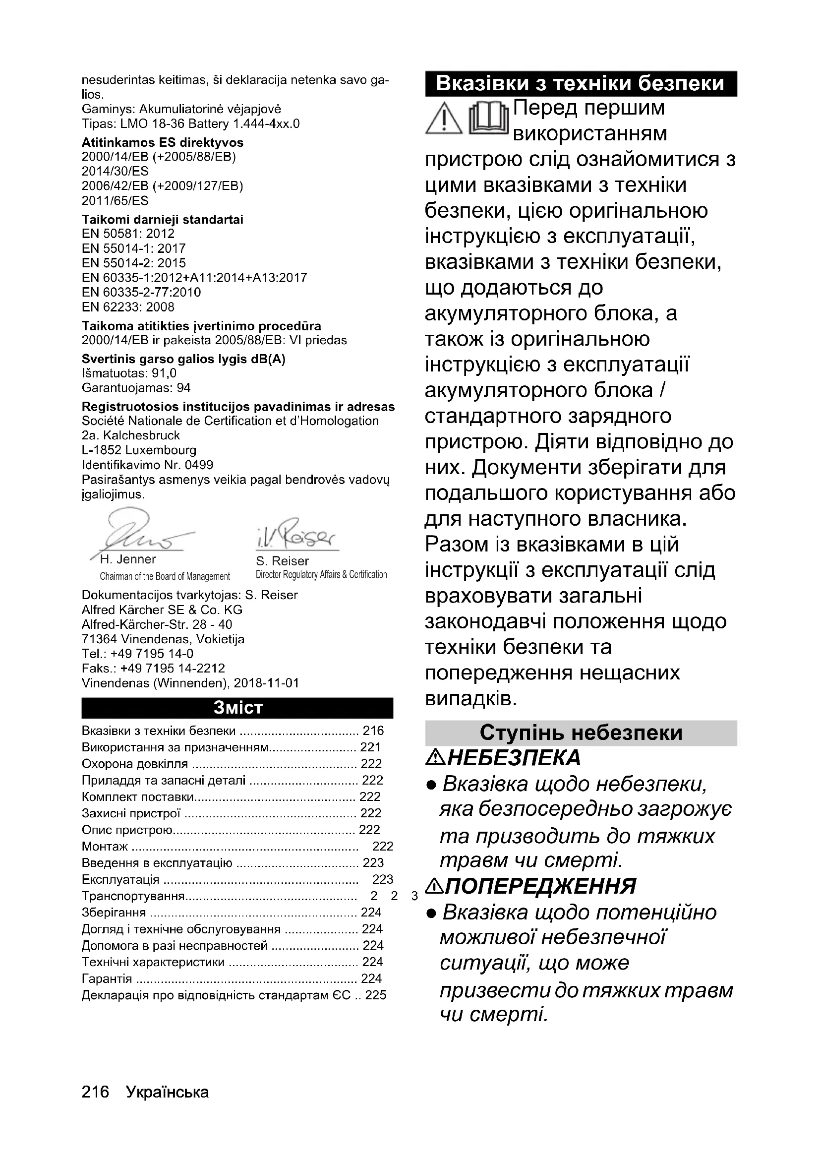 Рівень звукової потужності, дБ(A) Виміряний: 91,0 Гарантований: 94 Назва та адреса задіяного уповноваженого органу з сертифікації Société Nationale de Certification et d’Homologation 2a. Kalchesbruck L-1852 Luxembourg Iдентиф. ном. 0499 Особи, що нижче підписалися, діють від імені та за довіреністю керівництва. Особа, відповідальна за ведення документації: Ш. Райзер (S. Reiser) Alfred Kärcher SE & Co. KG Alfred-Kärcher-Str. 28 - 40 71364 Winnenden (Germany) Тел.: +49 7195 14-0 Факс: +49 7195 14-2212 м. Вінненден, 01.11.2018