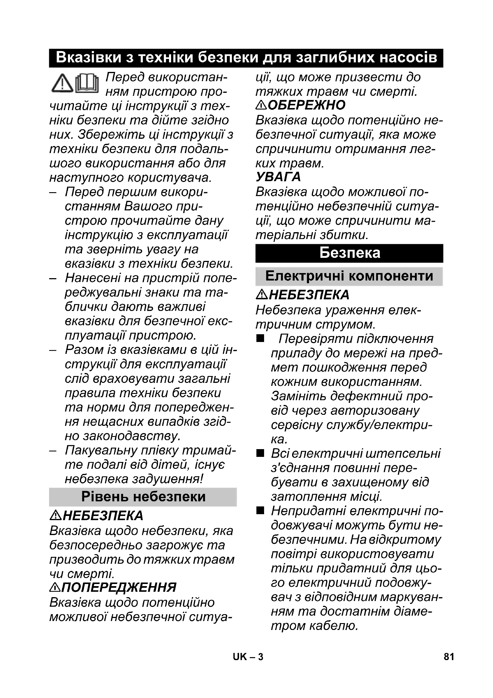 Всі електричні штепсельні з'єднання повинні пере- бувати в захищеному від затоплення місці. Непридатні електричні по- довжувачі можуть бути не- безпечними. На відкритому повітрі використовувати тільки придатний для цьо- го електричний подовжу- вач з відповідним маркуван- ням та достатнім діаме- тром кабелю. Вказівки з техніки безпеки для заглибних насосів Рівень небезпеки
