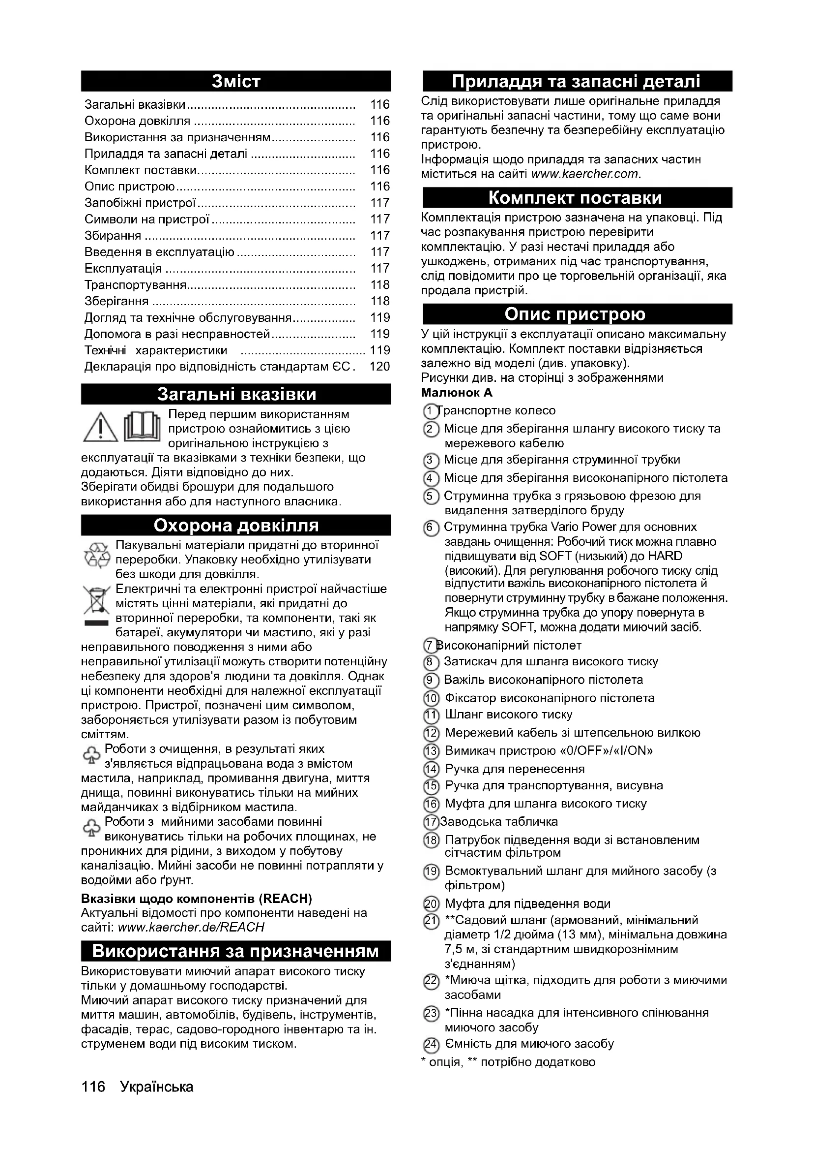 - опція, ** потрібно додатково Загальні вказівки................................................ 116 Охорона довкілля .............................................. 116 Використання за призначенням........................ 116 Приладдя та запасні деталі .............................. 116 Комплект поставки............................................. 116 Опис пристрою................................................... 116 Запобіжні пристрої............................................. 117 Символи на пристрої ......................................... 117 Збирання ............................................................ 117 Введення в експлуатацію.................................. 117 Експлуатація ...................................................... 117 Транспортування................................................ 118 Зберігання .......................................................... 118 Догляд та технічне обслуговування.................. 119 Допомога в разі несправностей........................ 119