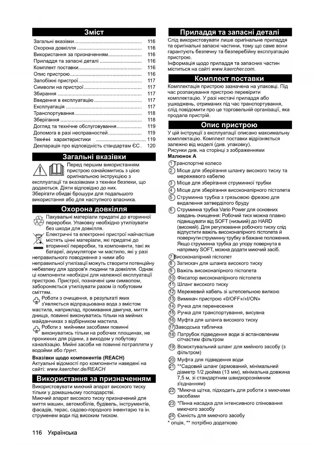 Інформація щодо приладдя та запасних частин міститься на сайті www.kaercher.com. Комплект поставки Комплектація пристрою зазначена на упаковці. Під час розпакування пристрою перевірити комплектацію. У разі нестачі приладдя або ушкоджень, отриманих під час транспортування, слід повідомити про це торговельній організації, яка продала пристрій. Опис пристрою У цій інструкції з експлуатації описано максимальну комплектацію. Комплект поставки відрізняється залежно від моделі (див. упаковку). Рисунки див. на сторінці з зображеннями Малюнок A 1 Транспортне колесо 2 Місце для зберігання шлангу високого тиску та мережевого кабелю 3 Місце для зберігання струминної трубки 4 Місце для зберігання високонапірного пістолета 5 Струминна трубка з грязьовою фрезою для видалення затверділого бруду 6 Струминна трубка Vario Power для основних завдань очищення: Робочий тиск можна плавно підвищувати від SOFT (низький) до HARD (високий). Для регулювання робочого тиску слід відпустити важіль високонапірного пістолета й повернути струминну трубку в бажане положення. Якщо струминна трубка до упору повернута в напрямку SOFT, можна додати миючий засіб. 7 Високонапірний пістолет 8 Затискач для шланга високого тиску 9 Важіль високонапірного пістолета 10 Фіксатор високонапірного пістолета 11 Шланг високого тиску 12 Мережевий кабель зі штепсельною вилкою 13 Вимикач пристрою «0/OFF»/«I/ON» 14 Ручка для перенесення 15 Ручка для транспортування, висувна 16 Муфта для шланга високого тиску 17 Заводська табличка 18 Патрубок підведення води зі встановленим сітчастим фільтром 19 Всмоктувальний шланг для мийного засобу (з