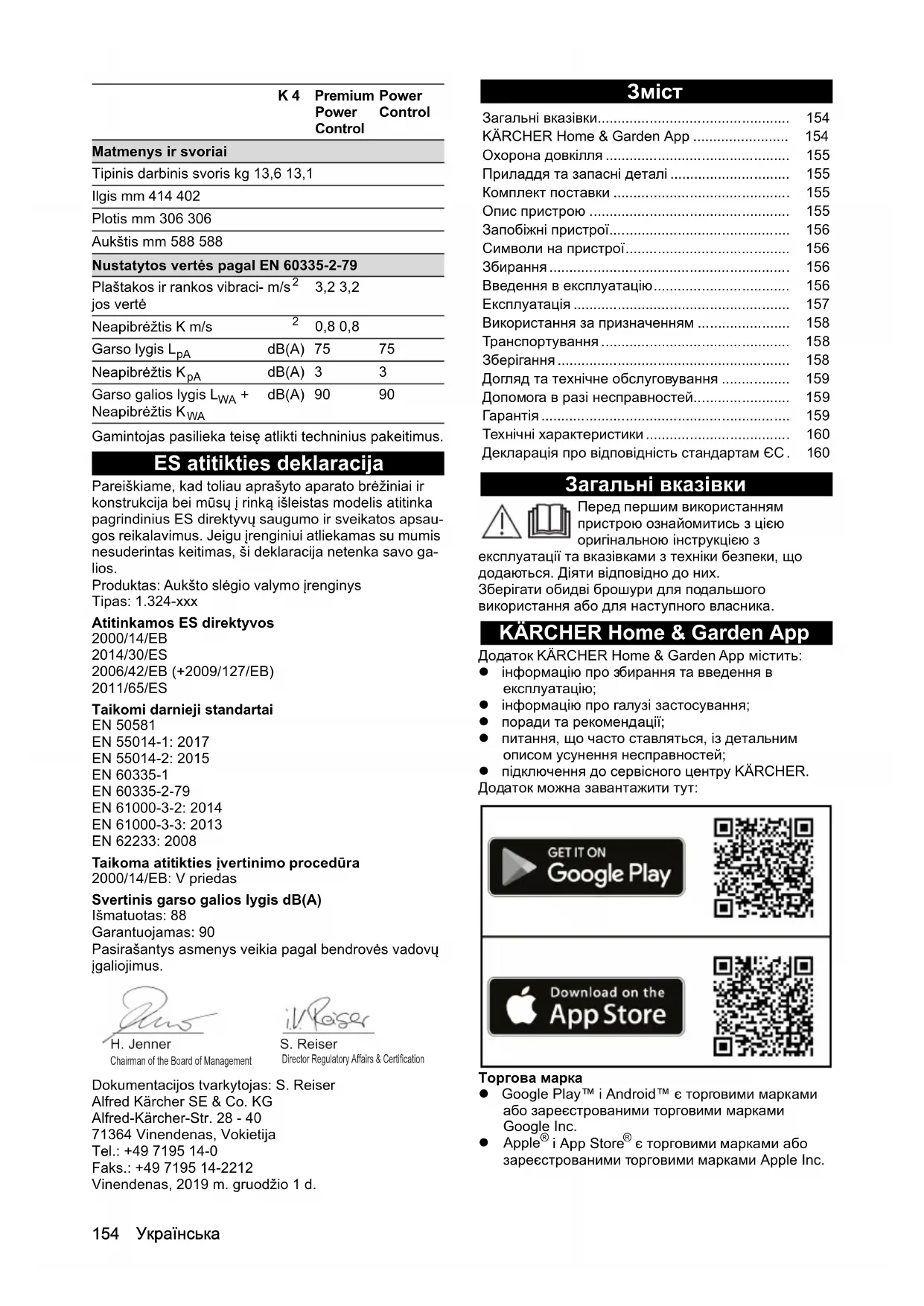 Загальні вказівки Перед першим використанням пристрою ознайомитись з цією оригінальною інструкцією з експлуатації та вказівками з техніки безпеки, що додаються. Діяти відповідно до них. Зберігати обидві брошури для подальшого використання або для наступного власника. KÄRCHER Home & Garden App Додаток KÄRCHER Home & Garden App містить: інформацію про збирання та введення в експлуатацію; інформацію про галузі застосування; поради та рекомендації; питання, що часто ставляться, із детальним описом усунення несправностей; підключення до сервісного центру KÄRCHER. Додаток можна завантажити тут: Торгова марка Google Play™ і Android™ є торговими марками або зареєстрованими торговими марками Google Inc. Apple
