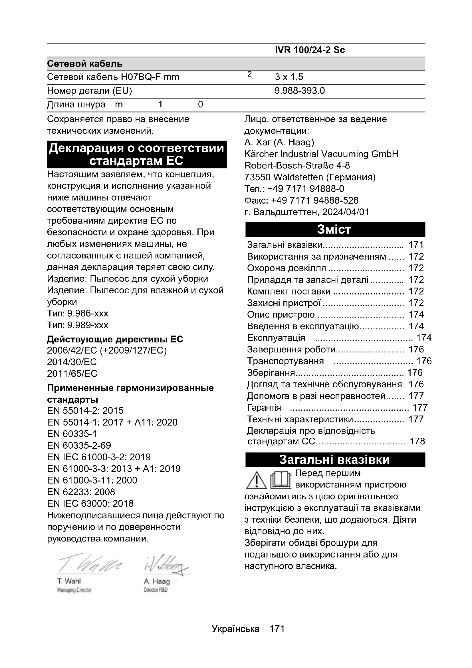 3 x 1,5 Номер деталі (EU) 9.988-393.0 Довжина кабелю m10 IVR 100/24-2 ScҚазақша 179 Особа, відповідальна за ведення документації: A. Гаг (A. Haag) Kärcher Industrial Vacuuming GmbH Robert-Bosch-Straße 4-8 73550 Waldstetten (Німеччина) Тел.: +49 7171 94888-0 Факс: +49 7171 94888-528 м. Вальдштеттен, 2024/04/01