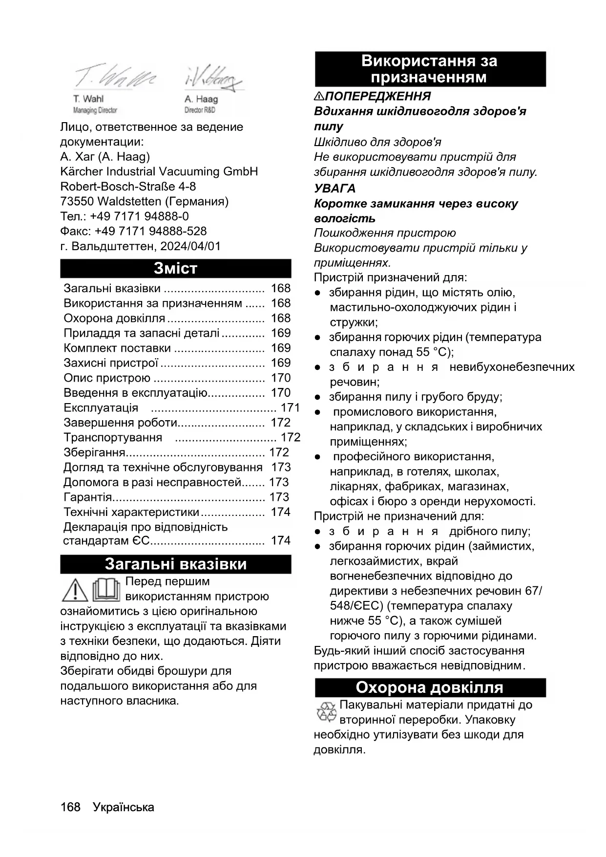 EN 61000-3-3: 2013 + A1: 2019 EN 61000-3-11: 2000 EN 62233: 2008 EN IEC 63000: 2018 Особи, що нижче підписалися, діють за дорученням і за довіреністю керівництва. Особа, відповідальна за ведення документації: A. Гаг (A. Haag) Kärcher Industrial Vacuuming GmbH Robert-Bosch-Straße 4-8 73550 Waldstetten (Німеччина) Тел.: +49 7171 94888-0 Факс: +49 7171 94888-528 м. Вальдштеттен, 2024/04/01
