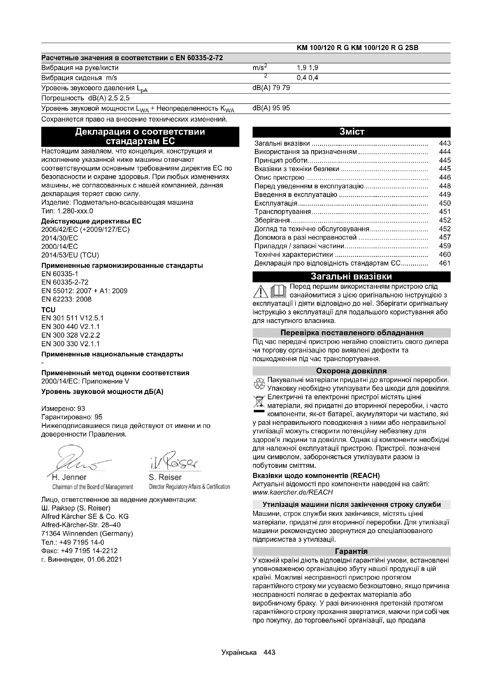 Застосовуваний метод оцінки відповідності 2000/14/EG: Додаток V Рівень звукової потужності, дБ(A) Виміряний: 93 Гарантований: 95 Особи, що нижче підписалися, діють від імені та за довіреністю керівництва. Особа, відповідальна за ведення документації: Ш. Райзер (S. Reiser) Alfred Kärcher SE & Co. KG Alfred-Kärcher-Str. 28 - 40 71364 Winnenden (Germany) Тел.: +49 7195 14-0 Факс: +49 7195 14-2212 м. Вінненден , 01.06.2021 Літраж cm