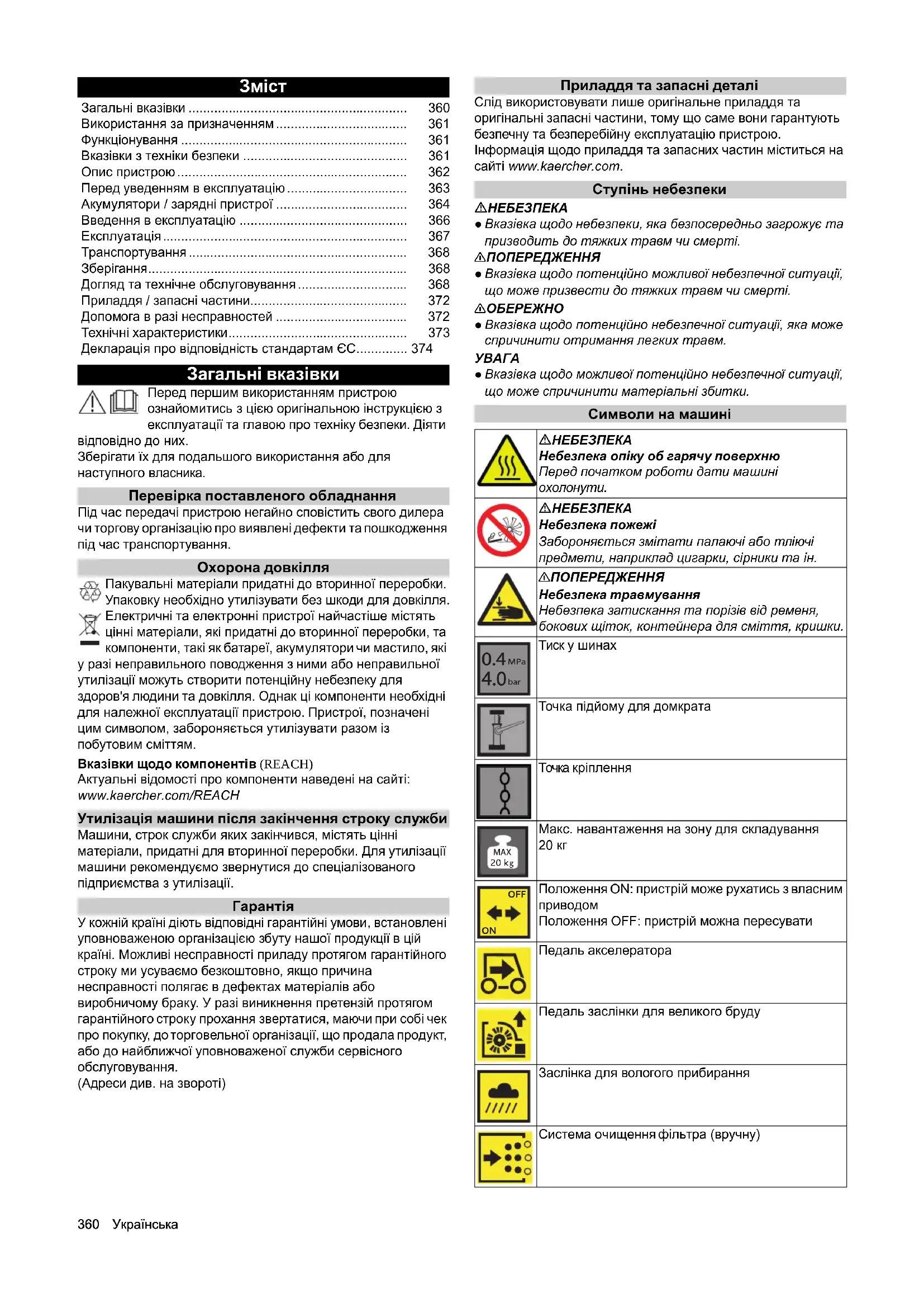 вільного одягу. ● Стежити за тим, щоб діти не грали з пристроєм. ● Забороняється працювати з пристроєм дітям та підліткам.УВАГА ● Перед початком руху перевірте навколишню зону (наприклад, на відсутність дітей). Слідкувати за достатнім оглядом! ● Забороняється залишати пристрій без нагляду, поки він заблокований від непередбачуваного пересування, під час зупинки пристрою стоянкове гальмо активується автоматично. ● Для запобігання несанкціонованого використання пристрою витягти ключ запалювання або чіп-ключ (KIK, Kärcher Intelligent Key).ОБЕРЕЖНО ● Не використовувати пристрій у зонах, у яких є вірогідність травмування падаючими предметами. Вказівки з техніки безпеки в режимі руху Вказівка ● Перелік щодо небезпеки перекидання не обмежується наведеними положеннями.НЕБЕЗПЕКА ● Небезпека перекидання пристрою на занадто крутих підйомах і схилах! Під час руху на підйомах і схилах враховувати максимально допустимі значення, зазначені в технічних характеристиках. ● Небезпека перекидання пристрою при великому бічному крені! Під час руху перпендикулярно напрямку руху враховувати максимально допустимі значення, зазначені в технічних характеристиках. ● Небезпека перекидання на нестабільній поверхні! Використовувати пристрій тільки на закріплених поверхнях. 몇 ПОПЕРЕДЖЕННЯ ● Небезпека нещасного випадку внаслідок неправильно обраної швидкості. На поворотах рухатись повільно. Пристрої, що працюють від акумулятора НЕБЕЗПЕКА ● Небезпека вибуху! Заряджати акумулятори тільки за допомогою спеціального зарядного пристрою. ● Під час заряджання акумуляторів у закритих362 Українська приміщеннях утворюється легко вибуховий газ. Заряджати акумулятори тільки у добре провітрюваних приміщеннях. ● Поблизу акумулятора або в акумуляторній заборонено використання відкритого вогню, створення іскор чи паління. ● Небезпека вибуху та короткого замикання. Не класти інструменти або подібні предмети на акумулятор. 몇 ОБЕРЕЖНО ● Небезпека травмування через електроліт. Дотримуватись відповідних правил техніки