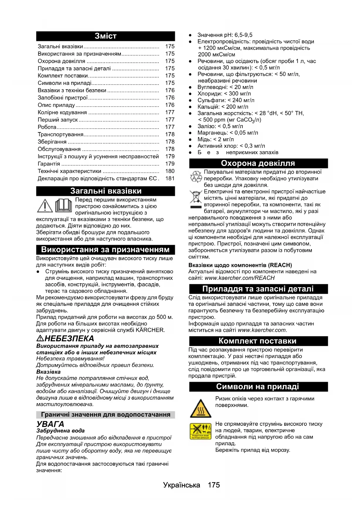 - Технічні характеристики Декларація про відповідність стандартам ЄС . 181 Ризик опіків через контакт з гарячими поверхнями. Не спрямовуйте струмінь високого тиску на людей, тварин, електричне обладнання під напругою або на сам p. 180