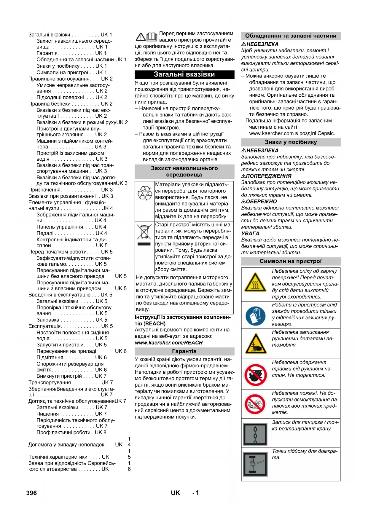 Вказівка щодо можливої потенційно не- безпечній ситуації, що може спричини- ти матеріальні збитки. Загальні вказівки . . . . . . . . . . UK 1 Захист навколишнього середо- вища . . . . . . . . . . . . . . . UK 1 Гарантія. . . . . . . . . . . . . UK 1 Обладнання та запасні частини UK 1 Знаки у посібнику . . . . . UK 1 Символи на пристрої . . UK 1 Правильне застосування. . . . UK 2 Умисне неправильне застосу- вання . . . . . . . . . . . . . . . UK 2 Підходящі поверхні . . . UK 2 Правила безпеки . . . . . . . . . . UK 2 Вказівки з безпеки під час екс- плуатації . . . . . . . . . . . . UK 2 Вказівки з безпеки в режимі рухуUK 2 Пристрої з двигунами вну- трішнього згоряння. . . . UK 2 Машини з підйомником контей- нера. . . . . . . . . . . . . . . . UK 3 Пристрій із захисним дахом водія . . . . . . . . . . . . . . . UK 3 Вказівки з безпеки під час тран- спортування машини . . UK 3 Вказівки з безпеки під час догля- ду та технічного обслуговуванняUK 3 Призначення. . . . . . . . . . . . . . UK 3 Вказівки при розвантаженні . UK 3 Елементи управління і функціо- нальні вузли . . . . . . . . . . . . . . UK 4 Зображення підмітальної маши- ни. . . . . . . . . . . . . . . . . . UK 4 Панель управління. . . . UK 4 Педалі . . . . . . . . . . . . . . UK 4 Контрольні індикатори та ди- сплей . . . . . . . . . . . . . . . UK 5 Перед початком роботи. . . . . UK 5 Зафіксувати/відпустити стоян- кове гальмо. . . . . . . . . . UK 5 Пересування підмітальної ма- шини без власного привода UK 5 Пересування підмітальної ма- шини з власним приводом UK 5 Введення в експлуатацію . . . UK 5 Загальні вказівки . . . . . UK 5 Перевірка і технічне обслугову- вання . . . . . . . . . . . . . . . UK 5 Заправка . . . . . . . . . . . . UK 5 Експлуатація. . . . . . . . . . . . . . UK 5 Настроїти положення сидіння водія . . . . . . . . . . . . . . . UK 5 Запустити пристрій. . . . UK 5 Пересування на приладі UK 6 Підмітання. . . . . . . . . . . UK 6 Спорожнити резервуар для сміття. . . . . . . . . . . . . . . UK 6 Вимкнути пристрій . . . . UK 7 Транспортування . . . . . . . . . . UK 7 Зберігання/Виведення з експлуата- ції. . . . . . . . . . . . . . . . . . . . . . . UK 7 Догляд та технічне обслуговуванняUK 7 Загальні вказівки . . . . . UK 7 Чищення . . . . . . . . . . . . UK 7 Періодичність технічного обслу- говування . . . . . . . . . . . UK 7 Профілактичні роботи . UK 8 Допомога у випадку неполадок UK