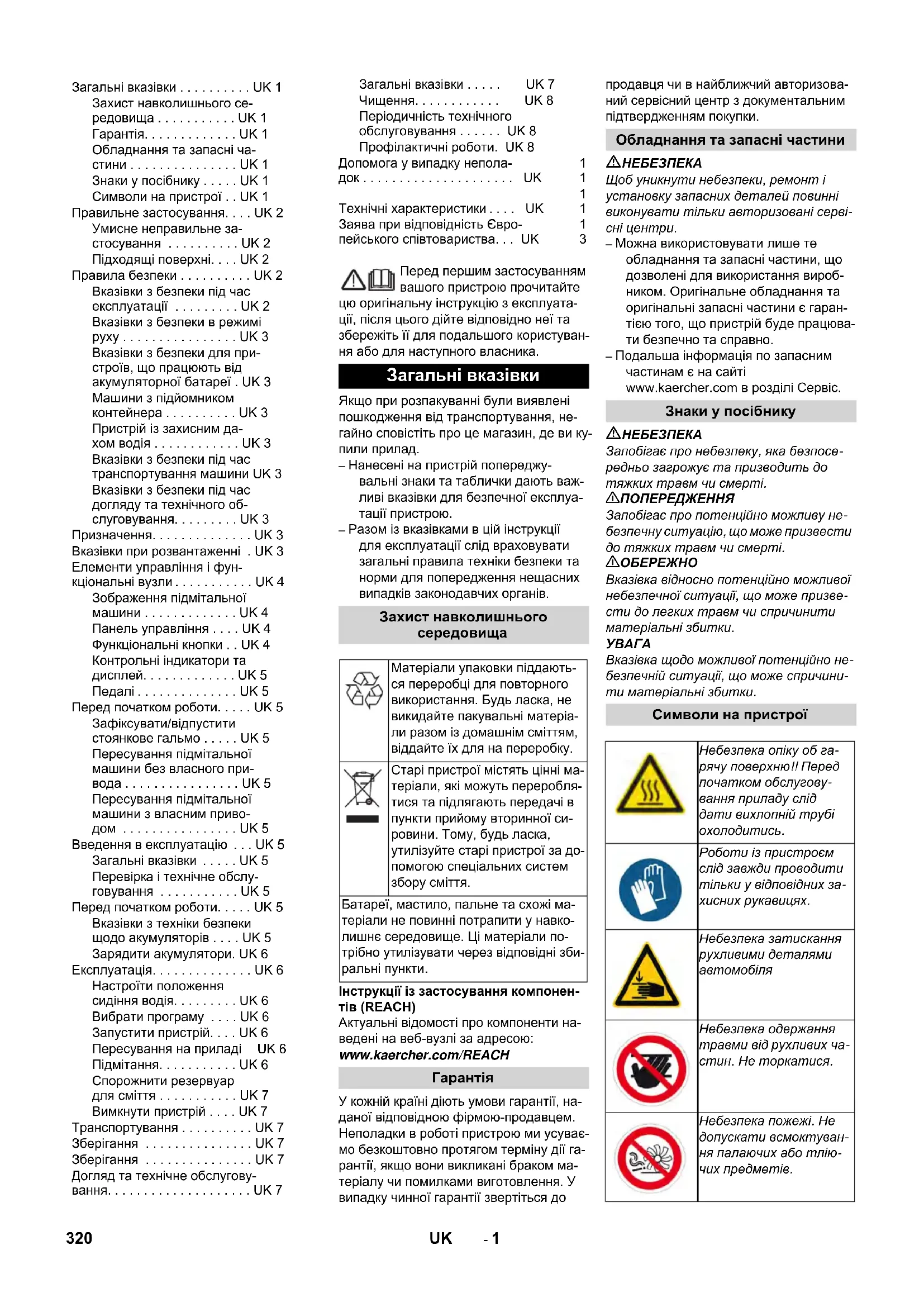 а і технічне обслу- говування . . . . . . . . . . . UK 5 Перед початком роботи. . . . . UK 5 Вказівки з техніки безпеки щодо акумуляторів . . . . UK 5 Зарядити акумулятори. UK 6 Експлуатація. . . . . . . . . . . . . . UK 6 Настроїти положення сидіння водія. . . . . . . . . UK 6 Вибрати програму . . . . UK 6 Запустити пристрій. . . . UK 6 Пересування на приладі UK 6 Підмітання. . . . . . . . . . . UK 6 Спорожнити резервуар для сміття . . . . . . . . . . . UK 7 Вимкнути пристрій . . . . UK 7 Транспортування . . . . . . . . . . UK 7 Зберігання . . . . . . . . . . . . . . . UK 7 Зберігання . . . . . . . . . . . . . . . UK 7 Догляд та технічне обслугову- вання. . . . . . . . . . . . . . . . . . . . UK 7 Загальні вказівки . . . . . UK 7 Чищення. . . . . . . . . . . . UK 8 Періодичність технічного обслуговування . . . . . . UK 8 Профілактичні роботи. UK 8 Допомога у випадку непола- док . . . . . . . . . . . . . . . . . . . . . UK