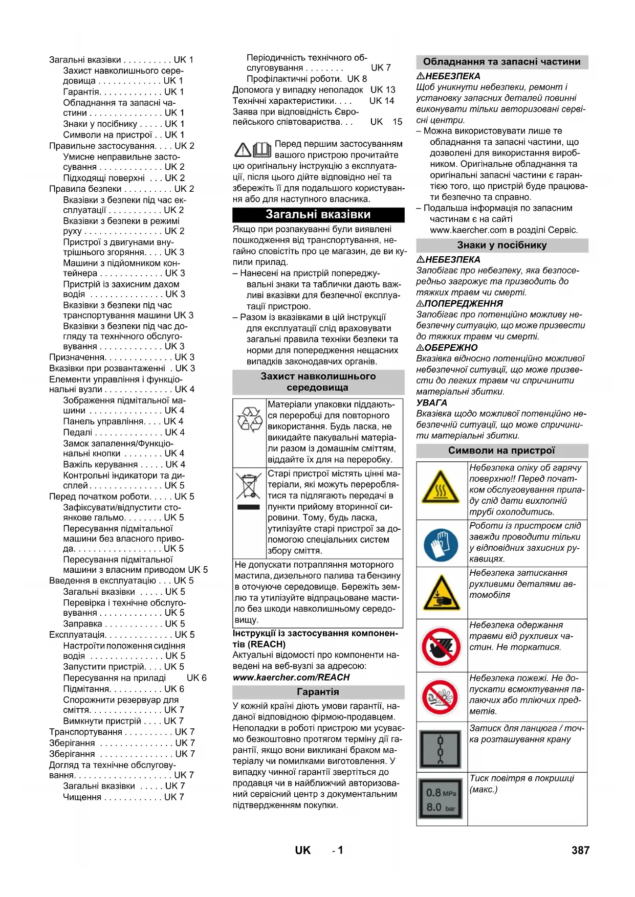 Taikyta atitikties vertinimo procedūra: 2000/14/EB: V priedas Garso galios lygis dB(A) Išmatuotas: 99 Garantuotas: 102 Chairman of the Board of Management Director Regulatory Affairs & Certification 386 LT- 1 Перед першим застосуванням вашого пристрою прочитайте цю оригінальну інструкцію з експлуата- ції, після цього дійте відповідно неї та збережіть її для подальшого користуван- ня або для наступного власника. Якщо при розпакуванні були виявлені пошкодження від транспортування, не- гайно сповістіть про це магазин, де ви ку- пили прилад. – Нанесені на пристрій попереджу- вальні знаки та таблички дають важ- ливі вказівки для безпечної експлуа- тації пристрою. – Разом із вказівками в цій інструкції для експлуатації слід враховувати загальні правила техніки безпеки та норми для попередження нещасних випадків законодавчих органів. Інструкції із застосування компонен- тів (REACH) Актуальні відомості про компоненти на- ведені на веб-вузлі за адресою: www.kaercher.com/REACH У кожній країні діють умови гарантії, на- даної відповідною фірмою-продавцем. Неполадки в роботі пристрою ми усуває- мо безкоштовно протягом терміну дії га- рантії, якщо вони викликані браком ма- теріалу чи помилками виготовлення. У випадку чинної гарантії звертіться до продавця чи в найближчий авторизова- ний сервісний центр з документальним підтвердженням покупки.