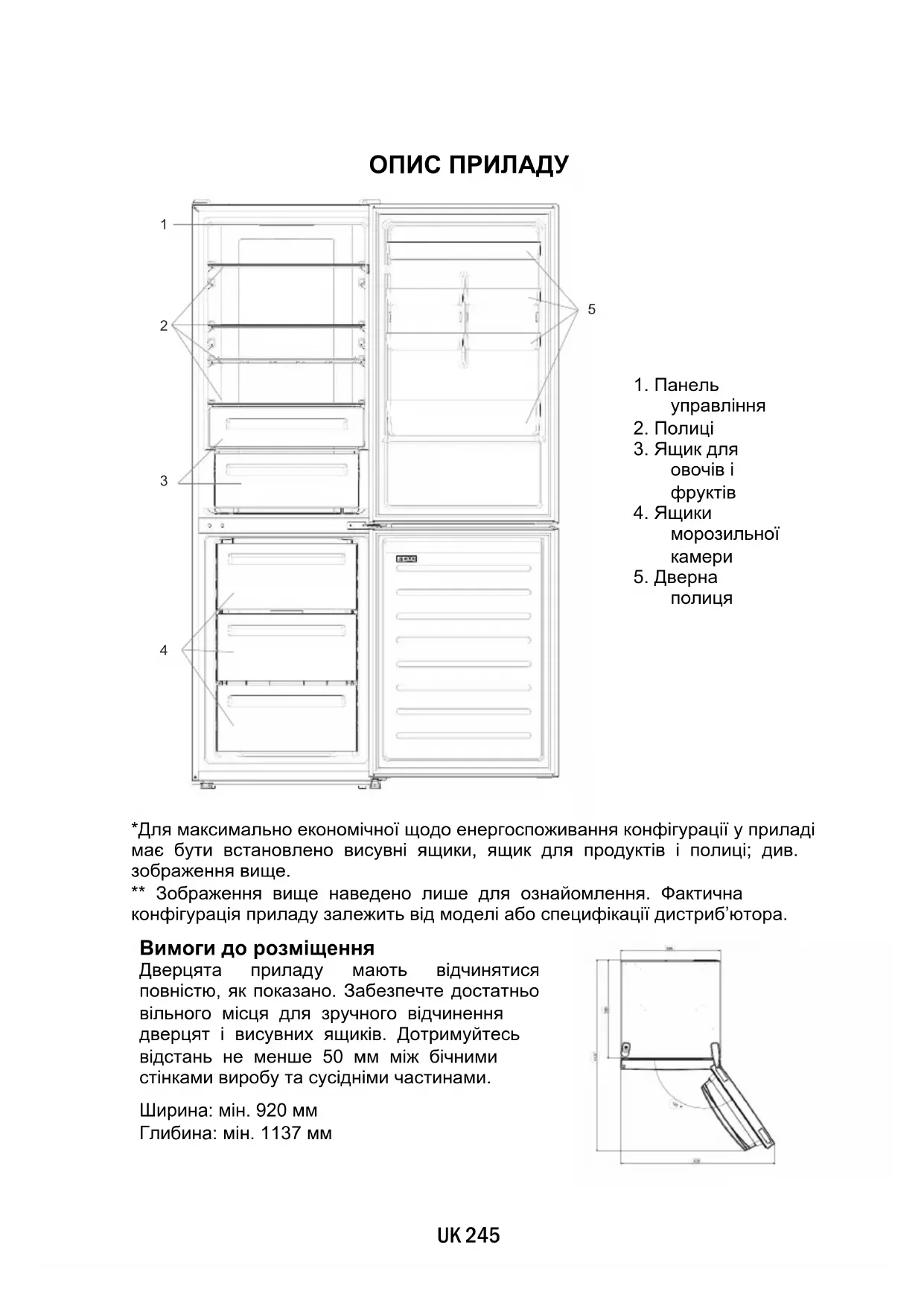 *Для максимально економічної щодо енергоспоживання конфігурації у приладі має бути встановлено висувні ящики, ящик для продуктів і полиці; див. зображення вище. ** Зображення вище наведено лише для ознайомлення. Фактична конфігурація приладу залежить від моделі або специфікації дистриб’ютора.