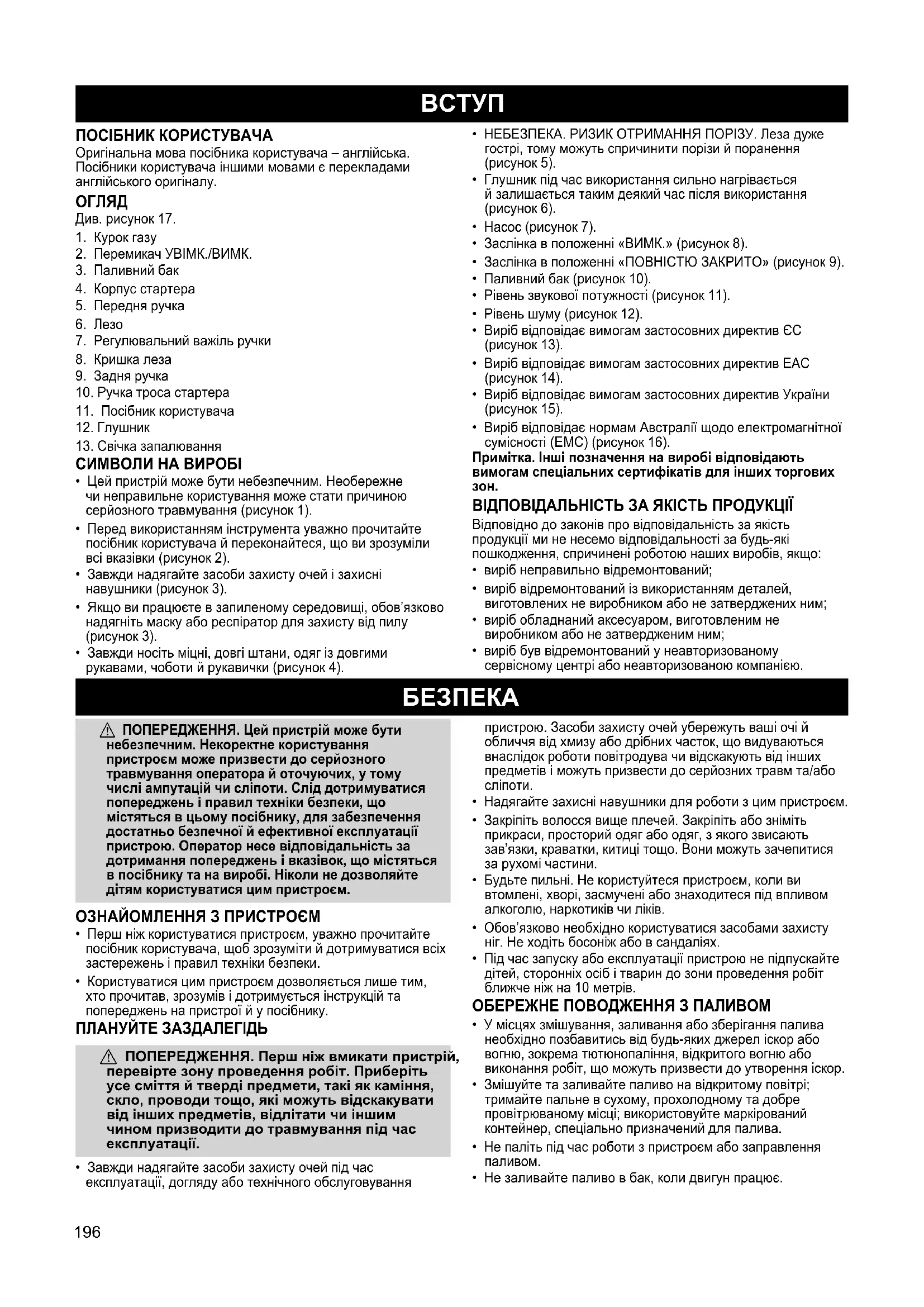 a ПОПЕРЕДЖЕННЯ. Цей пристрій може бути небезпечним. Некоректне користування пристроєм може призвести до серйозного травмування оператора й оточуючих, у тому числі ампутацій чи сліпоти. Слід дотримуватися попереджень і правил техніки безпеки, що містяться в цьому посібнику, для забезпечення достатньо безпечної й ефективної експлуатації пристрою. Оператор несе відповідальність за дотримання попереджень і вказівок, що містяться в посібнику та на виробі. Ніколи не дозволяйте дітям користуватися цим пристроєм. ОЗНАЙОМЛЕННЯ З ПРИСТРОЄМ