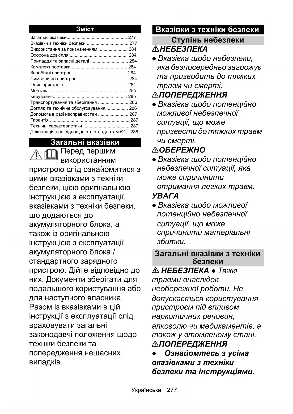 - НЕБЕЗПЕКА ● Тяжкі травми внаслідок необережної роботи. Не допускається користування пристроєм під впливом наркотичних речовин, алкоголю чи медикаментів, а також у втомленому стані. 몇 ПОПЕРЕДЖЕННЯ ● Ознайомтесь з усіма вказівками з техніки безпеки та інструкціями. Загальні вказівки p. 277