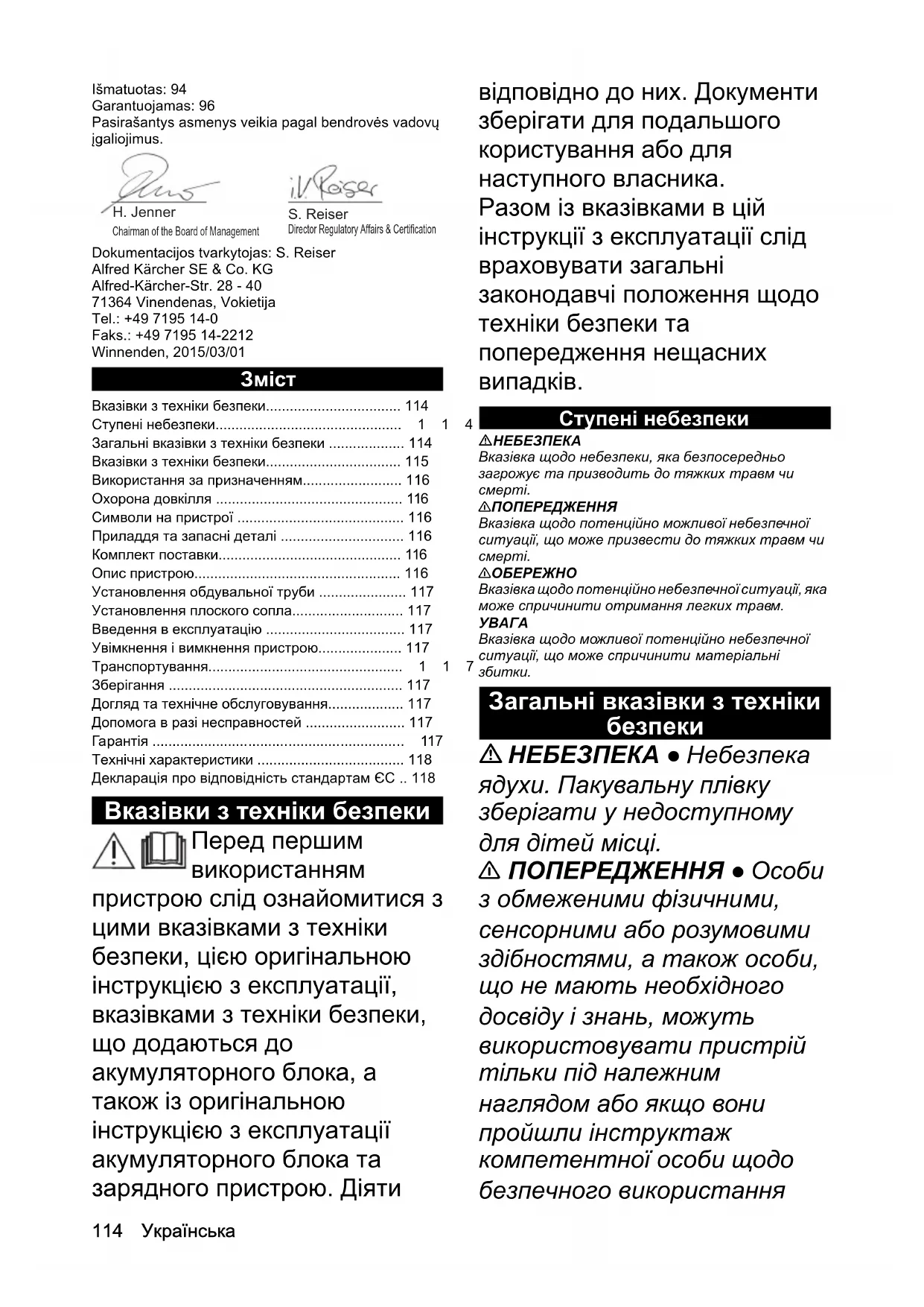 У кожній країні діють відповідні гарантійні умови, встановлені уповноваженою організацією збуту нашої продукції в цій країні. Можливі несправності приладу протягом гарантійного строку ми усуваємо безкоштовно, якщо причина несправності полягає в дефектах матеріалів або виробничому браку. У разі виникнення претензій протягом гарантійного строку прохання звертатися, маючи при собі чек про покупку, до торговельної організації, що продала продукт, або до найближчої уповноваженої служби сервісного обслуговування. (Адреси див. на звороті)118 Українська Технічні характеристики Зберігається право на внесення технічних змін. Декларація про відповідність стандартам ЄС Цим ми повідомляємо, що нижче зазначена машина на основі своєї конструкції та конструктивного виконання, а також у випущеної у продаж моделі, відповідає спеціальним основним вимогам щодо безпеки та захисту здоров'я представлених нижче директив ЄС. У разі внесення неузгоджених із нами змін до машини ця заява втрачає свою чинність. Виріб: Садова повітродувка Тип: LBL 2, LBL 4 Відповідні директиви ЄС 2000/14/ЄС 2006/42/ЄС (+2009/127/ЄС) 2011/65/ЄС 2014/30/ЄС Застосовувані гармонізовані стандарти EN 60335–1 EN 50636–2-100 EN 55014–1: 2006+A1: 2009+A2: 2011 EN 55014-2: 2015 EN 62233: 2008 EN 50581 Застосовуваний метод оцінки відповідності 2000/14/EG: Додаток V Рівень звукової потужності, дБ(A) LBL 2: Виміряний: 86 Гарантований: 88 LBL 4: Виміряний: 94 Гарантований: 96 Особи, що нижче підписалися, діють за дорученням і за довіреністю керівництва. Особа, відповідальна за ведення документації: Ш. Райзер (S. Reiser) Alfred Kärcher SE & Co. KG Alfred-Kärcher-Str. 28 - 40 71364 Winnenden (Німеччина) Тел.: +49 7195 14-0 Факс: +49 7195 14-2212 м. Вінненден, 01.03.2015 LBL 2 Battery LBL 2 Battery Set LBL 4 Battery LBL 4 Battery Set Робочі характеристики пристрою