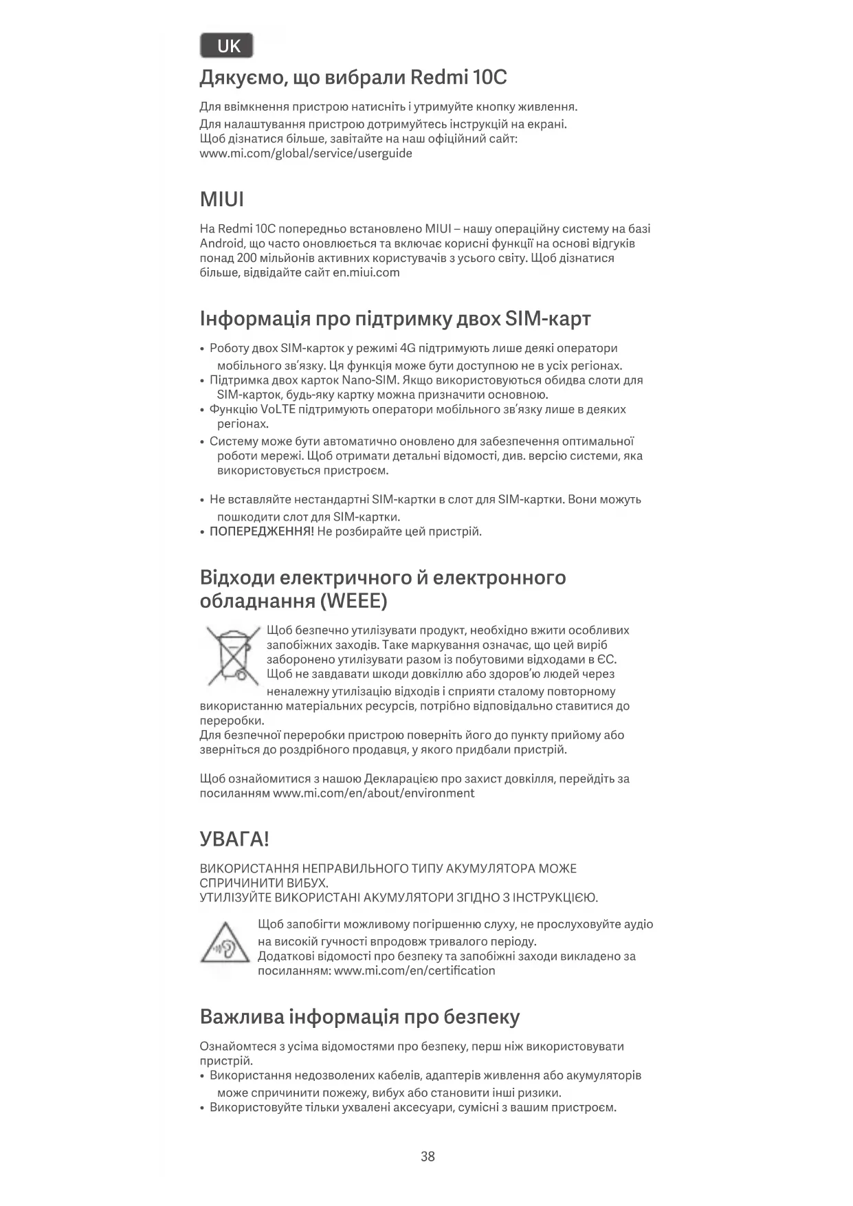 ВИКОРИСТАННЯ НЕПРАВИЛЬНОГО ТИПУ АКУМУЛЯТОРА МОЖЕ СПРИЧИНИТИ ВИБУХ. УТИЛІЗУЙТЕ ВИКОРИСТАНІ АКУМУЛЯТОРИ ЗГІДНО З ІНСТРУКЦІЄЮ. Щоб запобігти можливому погіршенню слуху, не прослуховуйте аудіо на високій гучності впродовж тривалого періоду. Додаткові відомості про безпеку та запобіжні заходи викладено за посиланням: www.mi.com/en/certification Важлива інформація про безпеку Ознайомтеся з усіма відомостями про безпеку, перш ніж використовувати