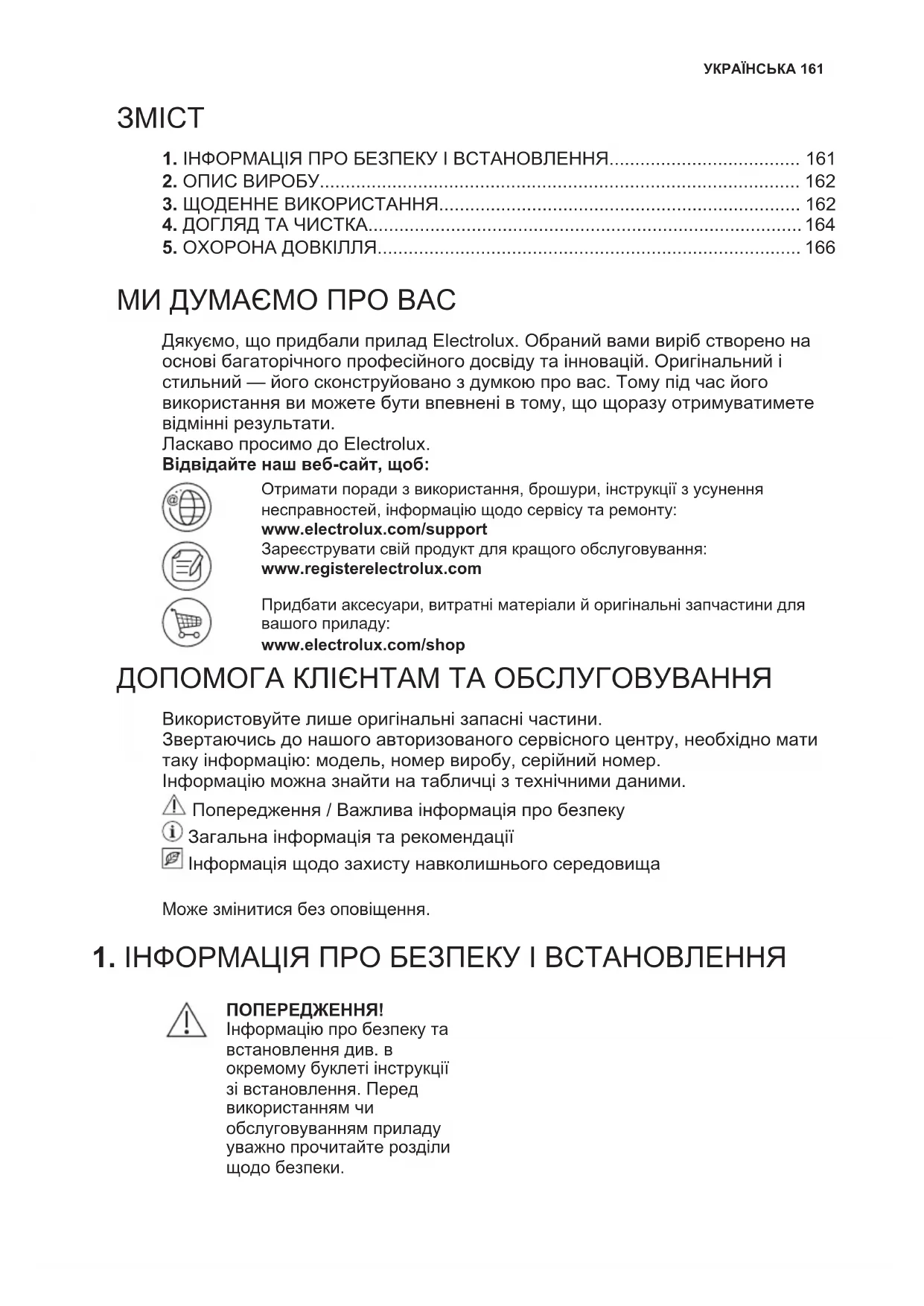МИ ДУМАЄМО ПРО ВАС Дякуємо, що придбали прилад Electrolux. Обраний вами виріб створено на основі багаторічного професійного досвіду та інновацій. Оригінальний і стильний — його сконструйовано з думкою про вас. Тому під час його використання ви можете бути впевнені в тому, що щоразу отримуватимете відмінні результати. Ласкаво просимо до Electrolux. Відвідайте наш веб-сайт, щоб: Отримати поради з використання, брошури, інструкції з усунення несправностей, інформацію щодо сервісу та ремонту: www.electrolux.com/support Зареєструвати свій продукт для кращого обслуговування: www.registerelectrolux.com Придбати аксесуари, витратні матеріали й оригінальні запчастини для вашого приладу: www.electrolux.com/shop ДОПОМОГА КЛІЄНТАМ ТА ОБСЛУГОВУВАННЯ Використовуйте лише оригінальні запасні частини. Звертаючись до нашого авторизованого сервісного центру, необхідно мати таку інформацію: модель, номер виробу, серійний номер. Інформацію можна знайти на табличці з технічними даними. Попередження / Важлива інформація про безпеку Загальна інформація та рекомендації Інформація щодо захисту навколишнього середовища Може змінитися без оповіщення.