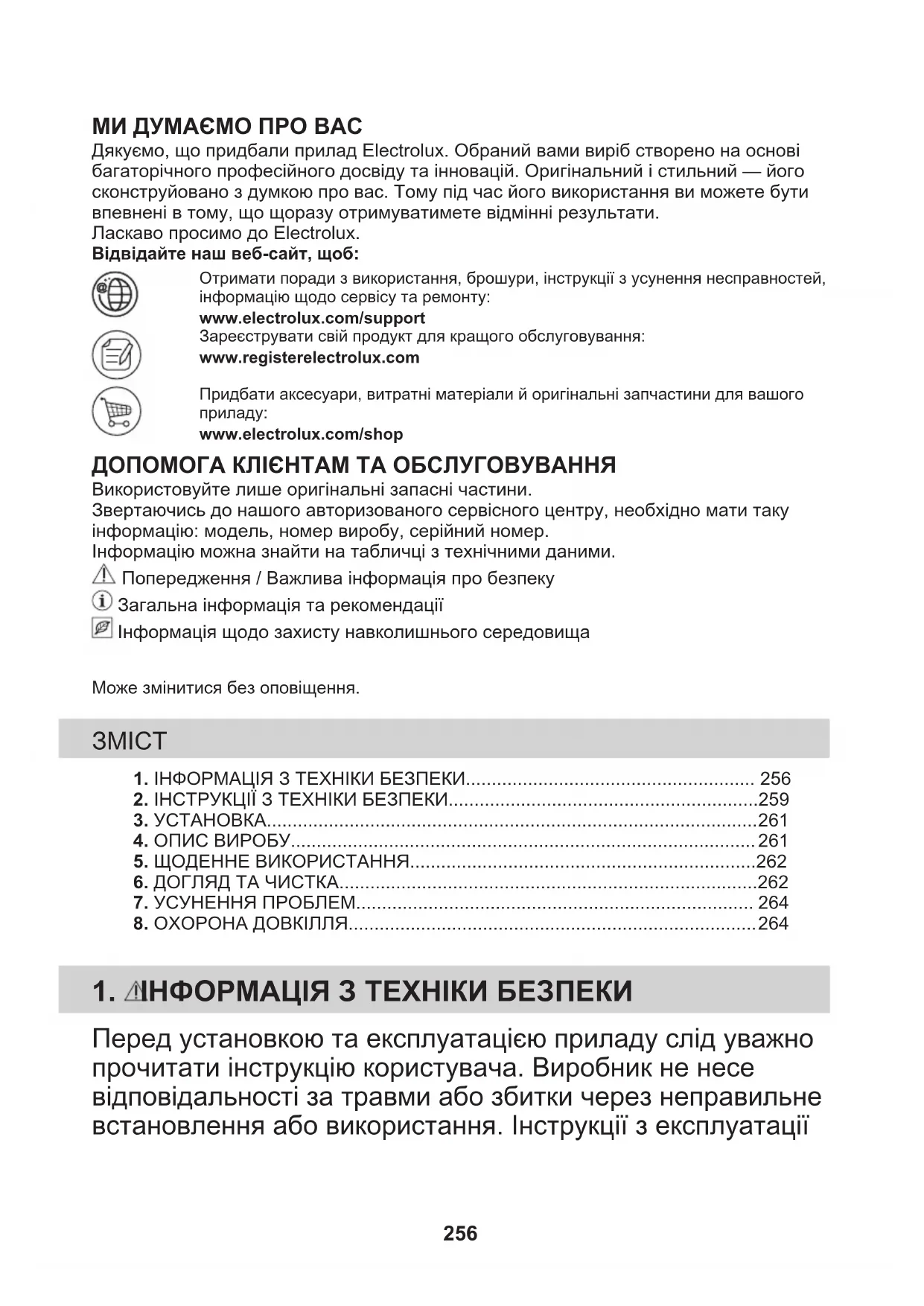Şu sembole sahip malzemeler geri dönüştürülebilir . Ambalajı geri dönüşüm için uygun konteynerlere koyun. Elektrikli ve elektronik cihaz atıklarının geri dönüşümüne ve çevre ve insan sağlığının korunmasına yardımcı olun. Ev atığı sembolü bulunan cihazları atmayın. Ürünü yerel geri dönüşüm tesislerinize gönderin ya da belediye ile irtibata geçin. 255МИ ДУМАЄМО ПРО ВАС Дякуємо, що придбали прилад Electrolux. Обраний вами виріб створено на основібагаторічного професійного досвіду та інновацій. Оригінальний і стильний — йогосконструйовано з думкою про вас. Тому під час його використання ви можете бутивпевнені в тому, що щоразу отримуватимете відмінні результати.Ласкаво просимо до Electrolux.Відвідайте наш веб-сайт, щоб:Отримати поради з використання, брошури, інструкції з усунення несправностей,інформацію щодо сервісу та ремонту:www.electrolux.com/supportЗареєструвати свій продукт для кращого обслуговування:www.registerelectrolux.comПридбати аксесуари, витратні матеріали й оригінальні запчастини для вашогоприладу:www.electrolux.com/shop ДОПОМОГА КЛІЄНТАМ ТА ОБСЛУГОВУВАННЯ Використовуйте лише оригінальні запасні частини.Звертаючись до нашого авторизованого сервісного центру, необхідно мати такуінформацію: модель, номер виробу, серійний номер.Інформацію можна знайти на табличці з технічними даними. Попередження / Важлива інформація про безпеку Загальна інформація та рекомендації Інформація щодо захисту навколишнього середовищаМоже змінитися без оповіщення. 1. ІНФОРМАЦІЯ З ТЕХНІКИ БЕЗПЕКИ........................................................ 2562. ІНСТРУКЦІЇ З ТЕХНІКИ БЕЗПЕКИ............................................................259
