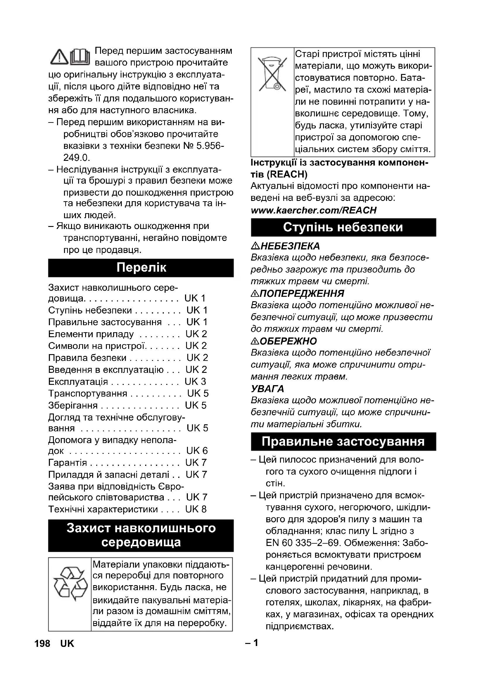 – Якщо виникають ошкодження при транспортуванні, негайно повідомте про це продавця. Інструкції із застосування компонен- тів (REACH) Актуальні відомості про компоненти на- ведені на веб-вузлі за адресою: www.kaercher.com/REACH