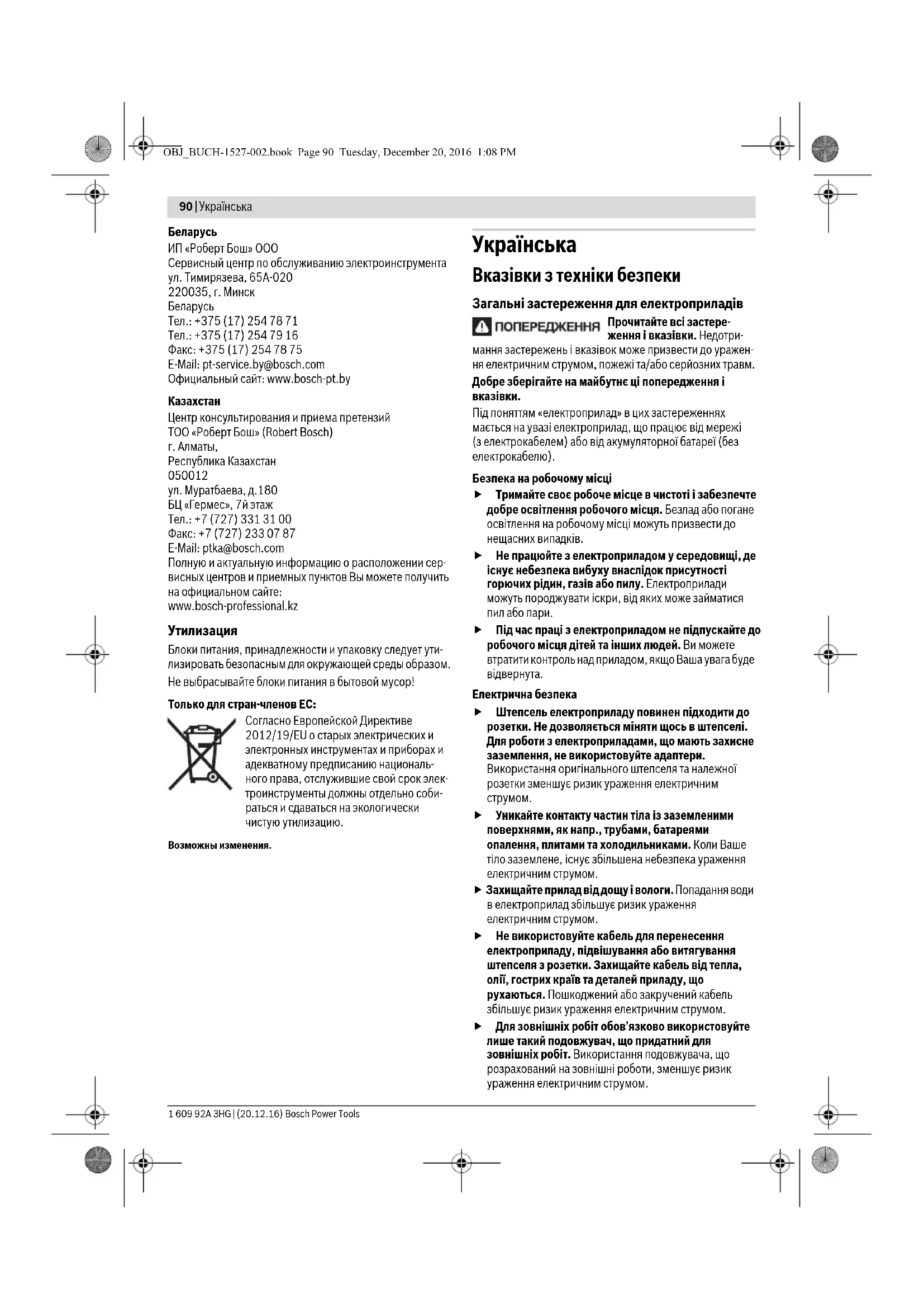 При всіх додаткових запитаннях та замовленні запчастин, будь ласка, зазначайте 10-значний номер для замовлення, що стоїть на паспортній табличці продукту. Гарантійне обслуговування і ремонт електроінструменту здійснюються відповідно до вимог і норм виготовлювача на території всіх країн лише у фірмових або авторизованих сервісних центрах фірми «Роберт Бош». OBJ_BUCH-1527-002.book Page 94 Tuesday, December 20, 2016 1:08 PMRomână | 95 Bosch Power Tools 1 609 92A 3HG | (20.12.16) ПОПЕРЕДЖЕННЯ! Використання контрафактної продукції небезпечне в експлуатації і може мати негативні наслідки для здоров’я. Виготовлення і розповсюдження контрафактної продукції переслідується за Законом в адміністративному і кримінальному порядку.