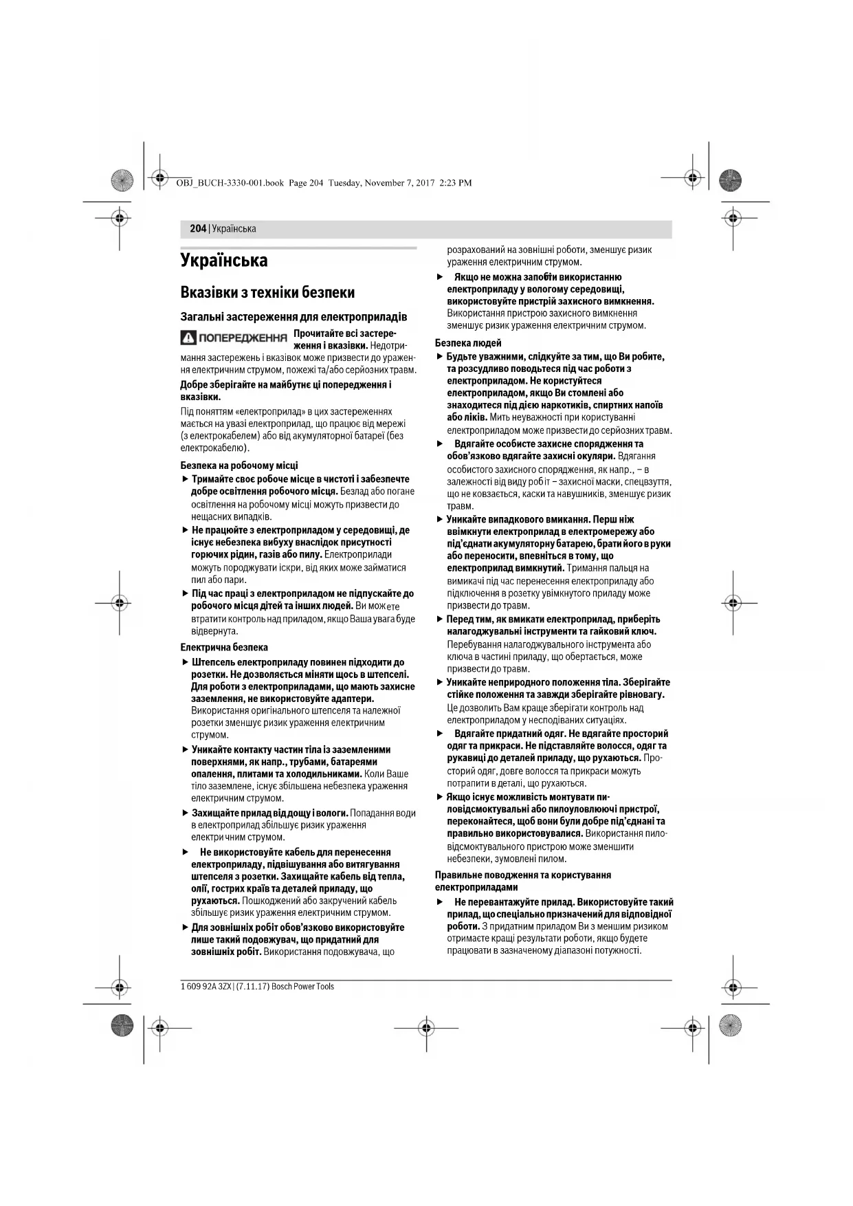 призвести до травм. Уникайте неприродного положення тіла. Зберігайте стійке положення та завжди зберігайте рівновагу. Це дозволить Вам краще зберігати контроль над електроприладом у несподіваних ситуаціях. Вдягайте придатний одяг. Не вдягайте просторий одяг та прикраси. Не підставляйте волосся, одяг та рукавиці до деталей приладу, що рухаються. Про- сторий одяг, довге волосся та прикраси можуть потрапити в деталі, що рухаються. Якщо існує можливість монтувати пи- ловідсмоктувальні або пилоуловлюючі пристрої, переконайтеся, щоб вони були добре під’єднані та правильно використовувалися. Використання пило- відсмоктувального пристрою м оже зменшити небезпеки, зумовлені пилом. Правильне поводження та користування електроприладами Не перевантажуйте прилад. Використовуйте такий прилад, що спеціально призначений для відповідної роботи. З придатним приладом Ви з меншим ризиком отримаєте кращі результати роботи, якщо будете працювати в зазначеному діапазоні потужності. OBJ_BUCH-3330-001.book Page 204 Tuesday, November 7, 2017 2:23 PMУкраїнська | 205 Bosch Power Tools 1 609 92A 3ZX | (7.11.17) Не користуйтеся електроприладом з пошкодженим вимикачем. Електроприлад, який не можна увімкнути або вимкнути, є небезпечним і його треба відремонтувати. Перед тим, як регулювати що-небудь на приладі, міняти приладдя або ховати прилад, витягніть штепсель із розетки та/або витягніть акумуляторну батарею. Ці попереджувальні заходи з техніки безпеки зменшують ризик випадкового запуску приладу. Ховайте електроприлади, якими Ви саме не користуєтесь, від дітей. Не дозволяйте користуватися електроприладом особам, що не знайомі з його роботою або не читали ці вказівки. У разі застосування недосвідченими особами прилади несуть в собі небезпеку. Старанно доглядайте за електроприладом. Перевіряйте, щоб рухомі детал