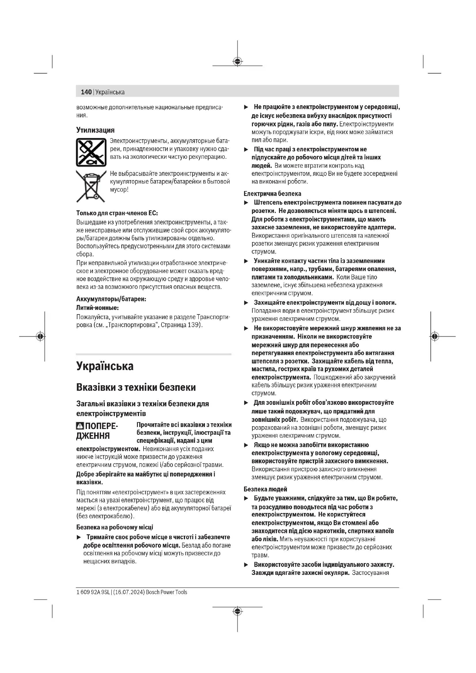 u Використовуйте засоби індивідуального захисту. Завжди вдягайте захисні окуляри. Застосування 1 609 92A 9SL | (16.07.2024) Bosch Power ToolsУкраїнська | 141 засобів індивідуального захисту для відповідних умов, напр.,захисної маски, спецвзуття, що не ковзається, каски та навушників, зменшує ризик травм. u Уникайте випадкового вмикання. Перш ніж увімкнути електроінструмент в електромережу або під’єднати акумуляторну батарею, брати його в руки або переносити, впевніться в тому, що електроінструмент вимкнений. Тримання пальця на вимикачі під час перенесення електроінструмента або підключення в розетку увімкнутого електроінструмента може призвести до травм. u Перед тим, як вмикати електроінструмент, приберіть налагоджувальні інструменти або гайковий ключ. Перебування налагоджувального інструмента або ключа в частині електроінструмента, що обертається, може призвести до травм. u Уникайте неприродного положення тіла. Завжди зберігайте стійке положення та тримайте рівновагу. Це дозволить Вам краще контролювати електроінструмент у небезпечних ситуаціях. u Вдягайте придатний одяг. Не вдягайте просторий одяг та прикраси. Не підставляйте волосся й одяг до деталей, що рухаються. Просторий одяг, довге волосся та прикраси можуть потрапити в деталі, що