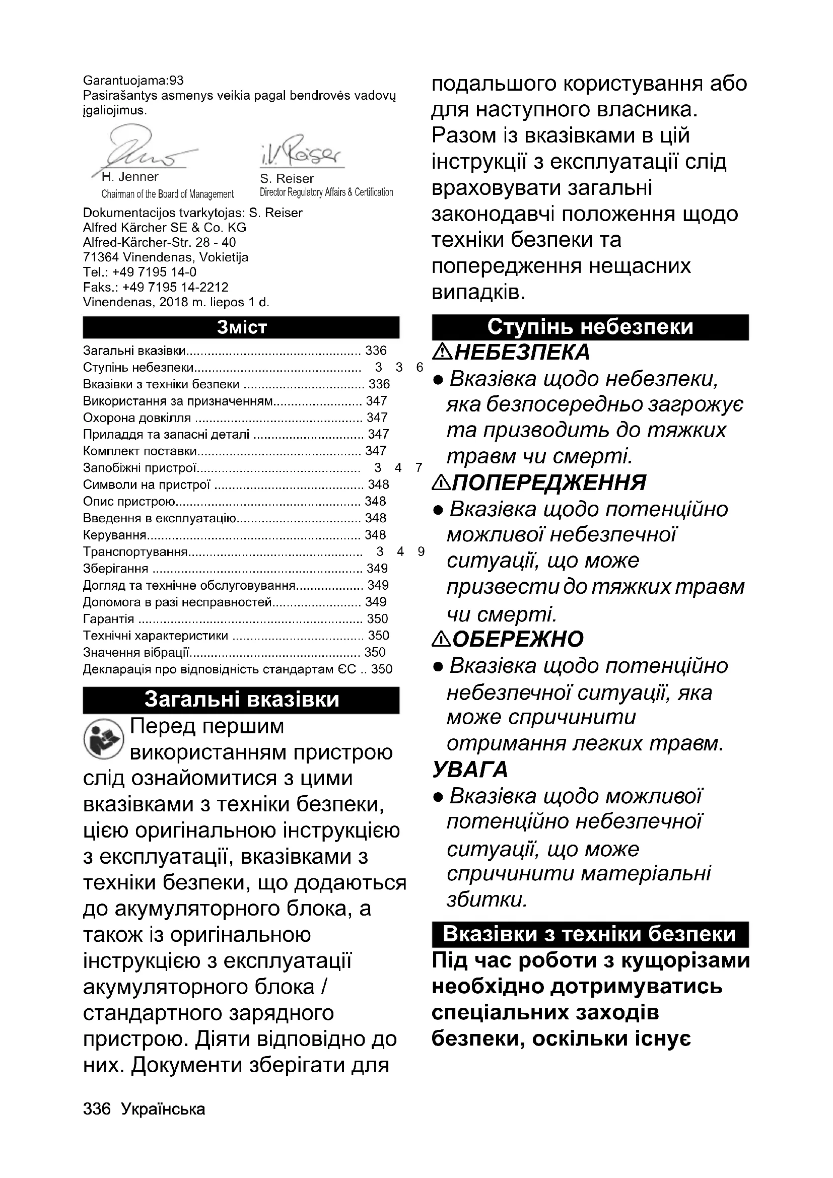 Рівень звукової потужності, дБ(A) Виміряний:89.1 Гарантований:93 Особи, що нижче підписалися, діють від імені та за довіреністю керівництва. Особа, відповідальна за ведення документації: Ш. Райзер (S. Reiser) Alfred Kärcher SE & Co. KG Alfred-Kärcher-Str. 28 - 40 71364 Winnenden (Germany) Тел.: +49 7195 14-0 Факс: +49 7195 14-2212 м. Вінненден, 01.07.2018