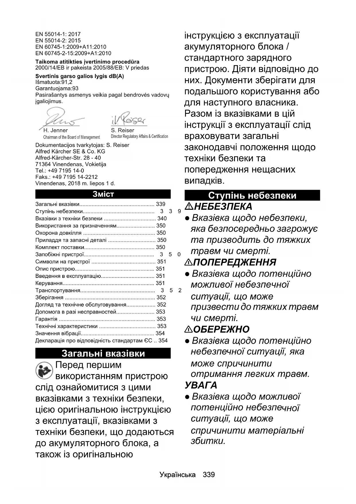 Рівень звукової потужності, дБ(A) Виміряний:91,2 Гарантований:93 Особи, що нижче підписалися, діють від імені та за довіреністю керівництва. Особа, відповідальна за ведення документації: Ш. Райзер (S. Reiser) Alfred Kärcher SE & Co. KG Alfred-Kärcher-Str. 28 - 40 71364 Winnenden (Germany) Тел.: +49 7195 14-0 Факс: +49 7195 14-2212 м. Вінненден, 01.07.2018 Chairman of the Board of ManagementDirector Regulatory Affairs & Certification H. Jenner S. ReiserҚазақша 355
