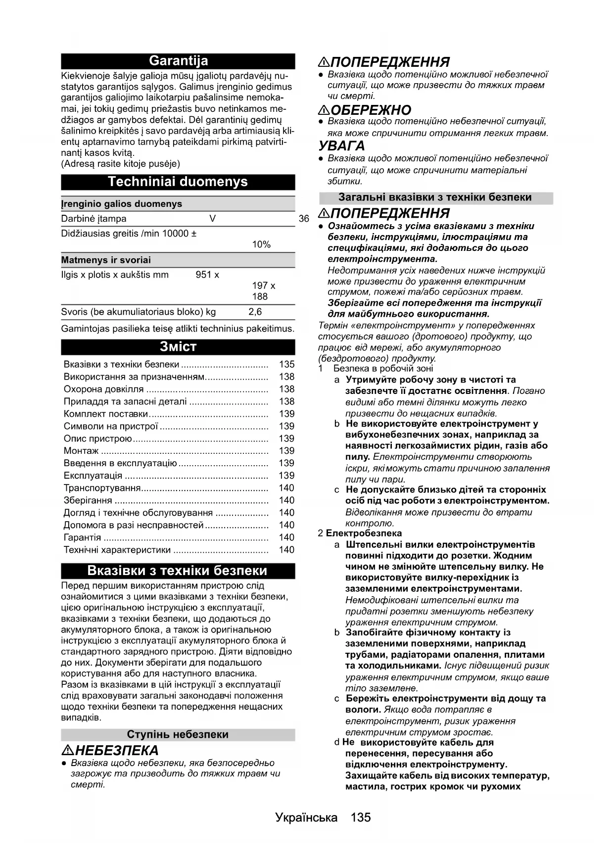 • Svoris (be akumuliatoriaus bloko) kg 2,6 Вказівки з техніки безпеки p. 135