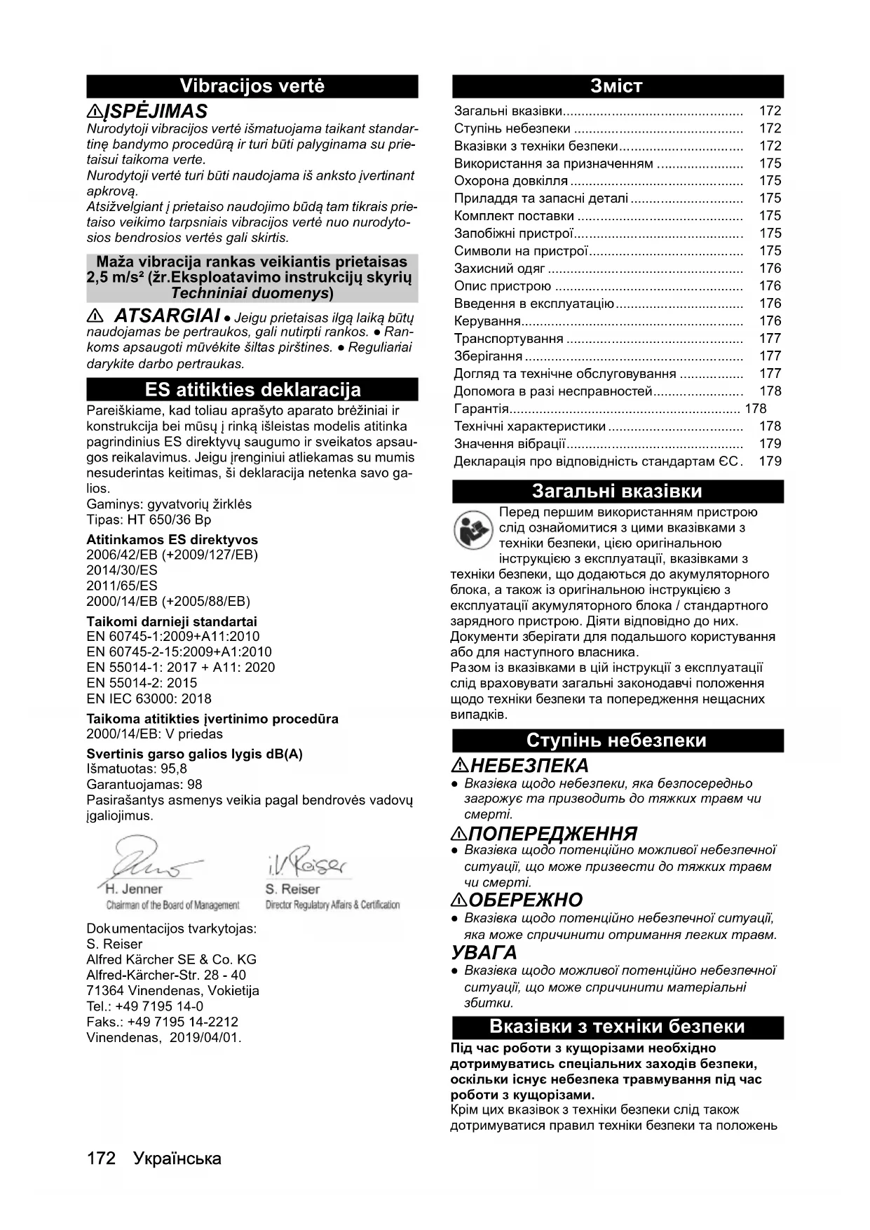 Тип: HT 650/36 Bp Відповідні директиви ЄС 2006/42/EG (+2009/127/EG) 2014/30/ЄС 2011/65/ЄС 2000/14/ЄС (+2005/88/ЄС) Застосовувані гармонізовані стандарти EN 60745-1:2009+A11:2010 EN 60745-2-15:2009+A1:2010 EN 55014-1: 2017 + A11: 2020 EN 55014-2: 2015 EN IEC 63000: 2018 Застосовуваний метод оцінки відповідності 2000/14/ЄС: Додаток V Рівень звукової потужності, дБ(A) Виміряний: 95,8 Гарантований: 98 Особи, що нижче підписалися, діють від імені та за довіреністю керівництва. Особа, відповідальна за ведення документації: Ш. Райзер (S. Reiser) Alfred Kärcher SE & Co. KG Alfred-Kärcher-Str. 28 - 40 71364 Winnenden (Germany) Тел.: +49 7195 14-0 Факс: +49 7195 14-2212 м. Вінненден, 2019/04/01.