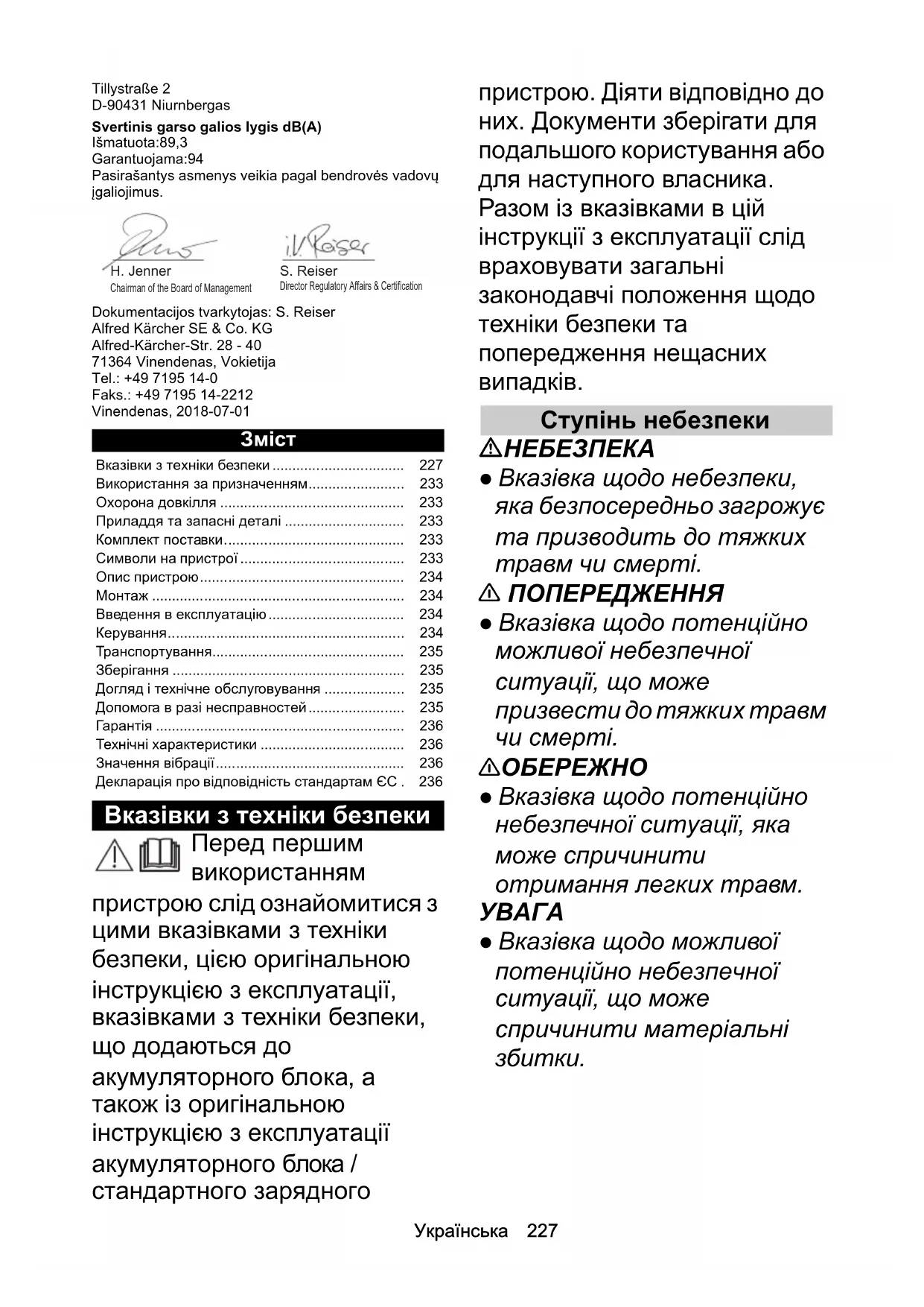 Назва та адреса задіяного уповноваженого органу з сертифікації TÜV Rheinland LGA Products GmbH (NB 0197) Tillystraße 2 D-90431 Nürnberg Рівень звукової потужності, дБ(A) Виміряний:89,3 Гарантований:94 Особи, що нижче підписалися, діють від імені та за довіреністю керівництва. Особа, відповідальна за ведення документації: Ш. Райзер (S. Reiser) Alfred Kärcher SE & Co. KG Alfred-Kärcher-Str. 28 - 40 71364 Winnenden (Germany) Тел.: +49 7195 14-0 Факс: +49 7195 14-2212 м. Вінненден, 01.07.2018