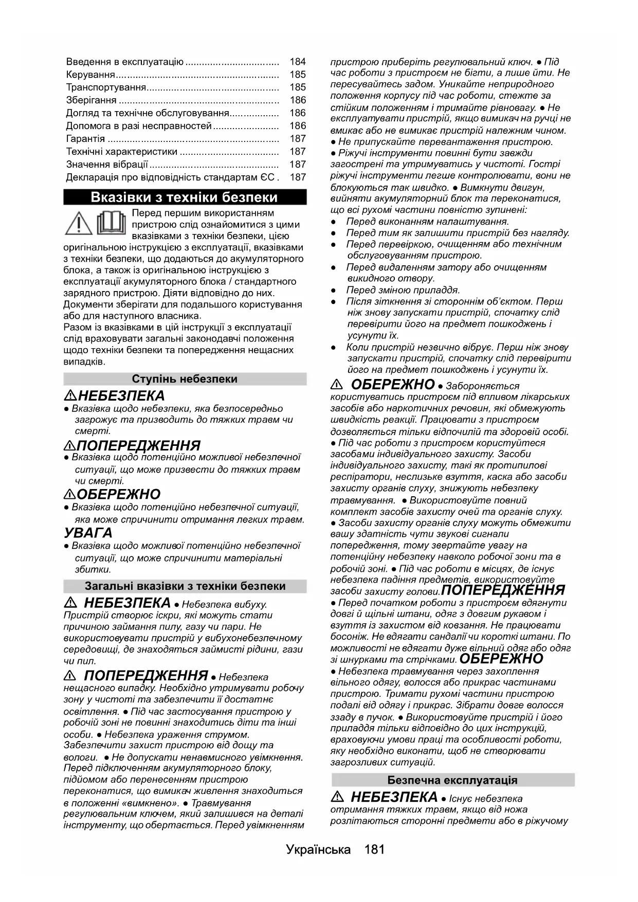 - Вказівки з техніки безпеки p. 181