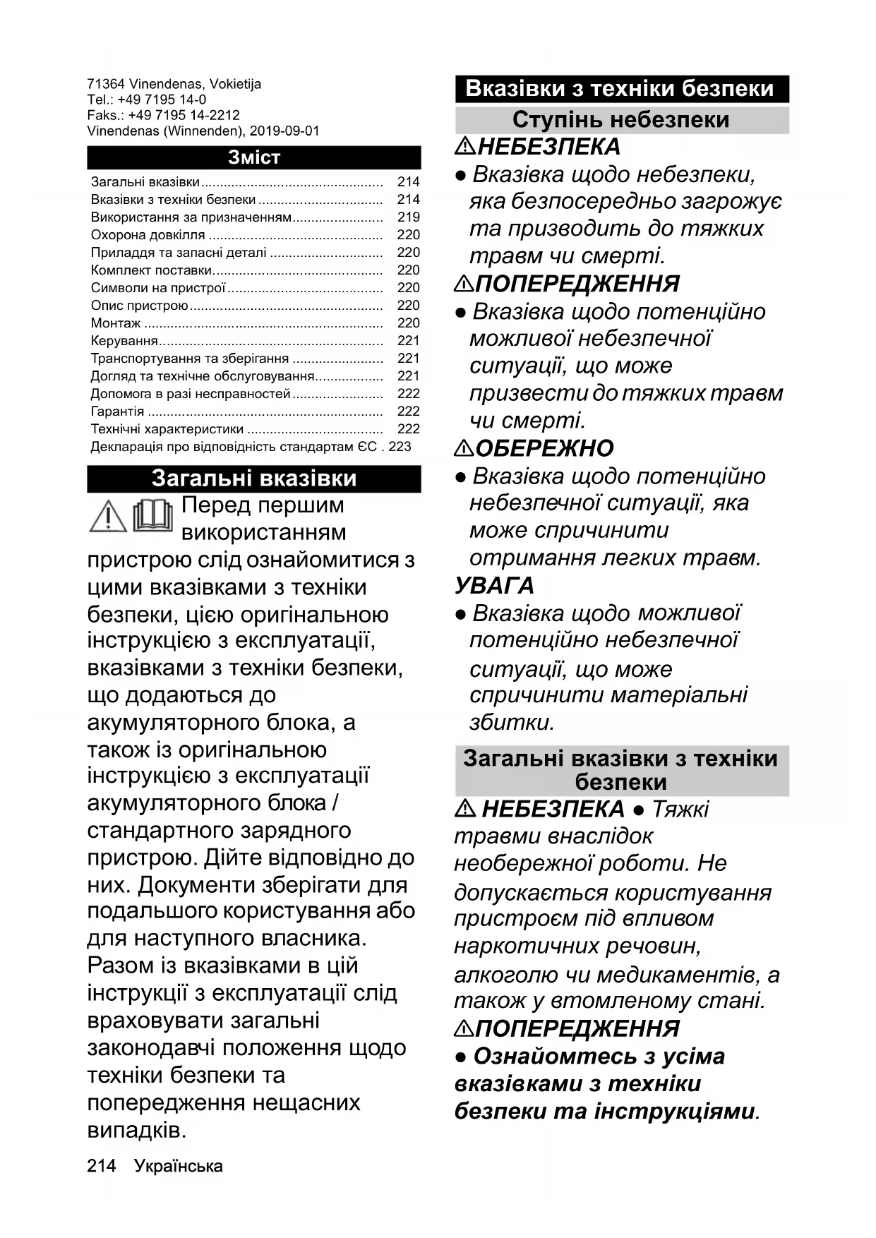 Загальні вказівки Перед першим використанням пристрою слід ознайомитися з цими вказівками з техніки безпеки, цією оригінальною інструкцією з експлуатації, вказівками з техніки безпеки, що додаються до акумуляторного блока, а також із оригінальною інструкцією з експлуатації акумуляторного блока / стандартного зарядного пристрою. Дійте відповідно до них. Документи зберігати для подальшого користування або для наступного власника. Разом із вказівками в цій інструкції з експлуатації слід враховувати загальні законодавчі положення щодо техніки безпеки та попередження нещасних