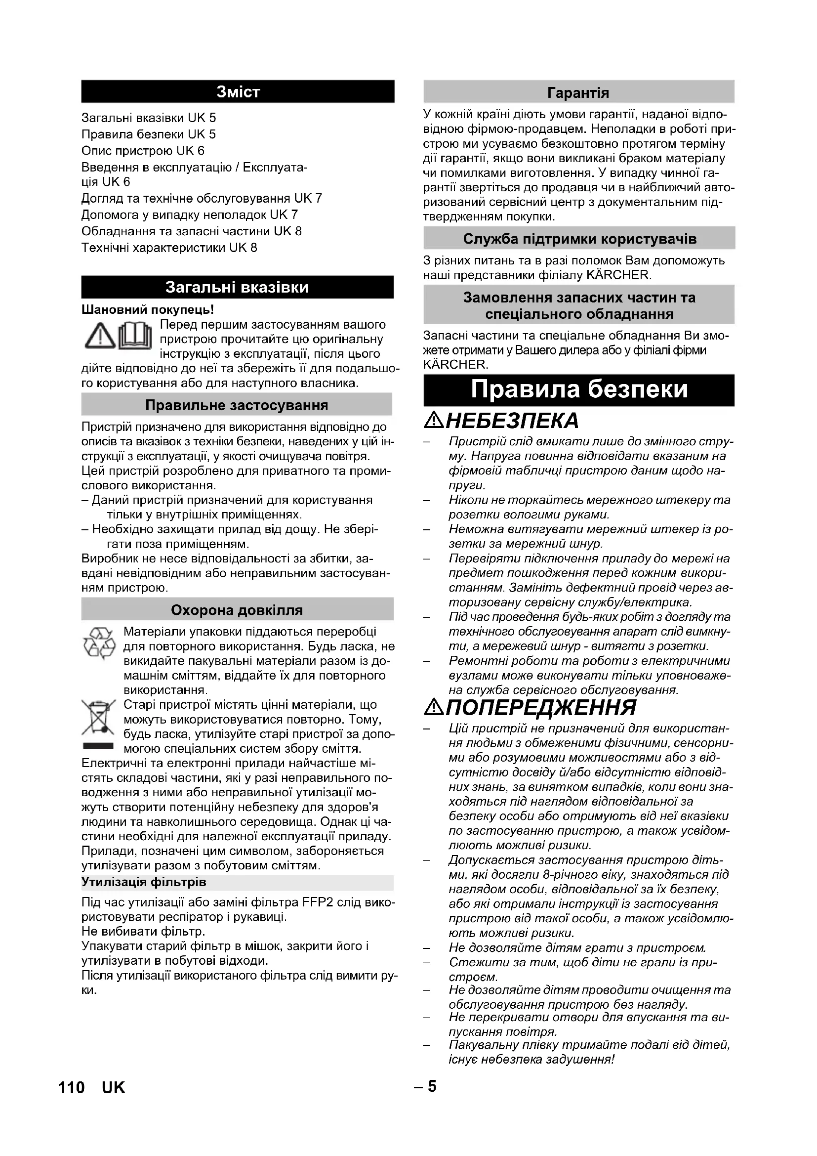 Загальні вказівки UK 5 Правила безпеки UK 5 Опис пристрою UK 6 Введення в експлуатацію / Експлуата- ція UK 6 Догляд та технічне обслуговування UK 7 Допомога у випадку неполадок UK 7 Обладнання та запасні частини UK 8 Технічні характеристики UK 8 Загальні вказівки Правильне застосування Охорона довкілля Утилізація фільтрів