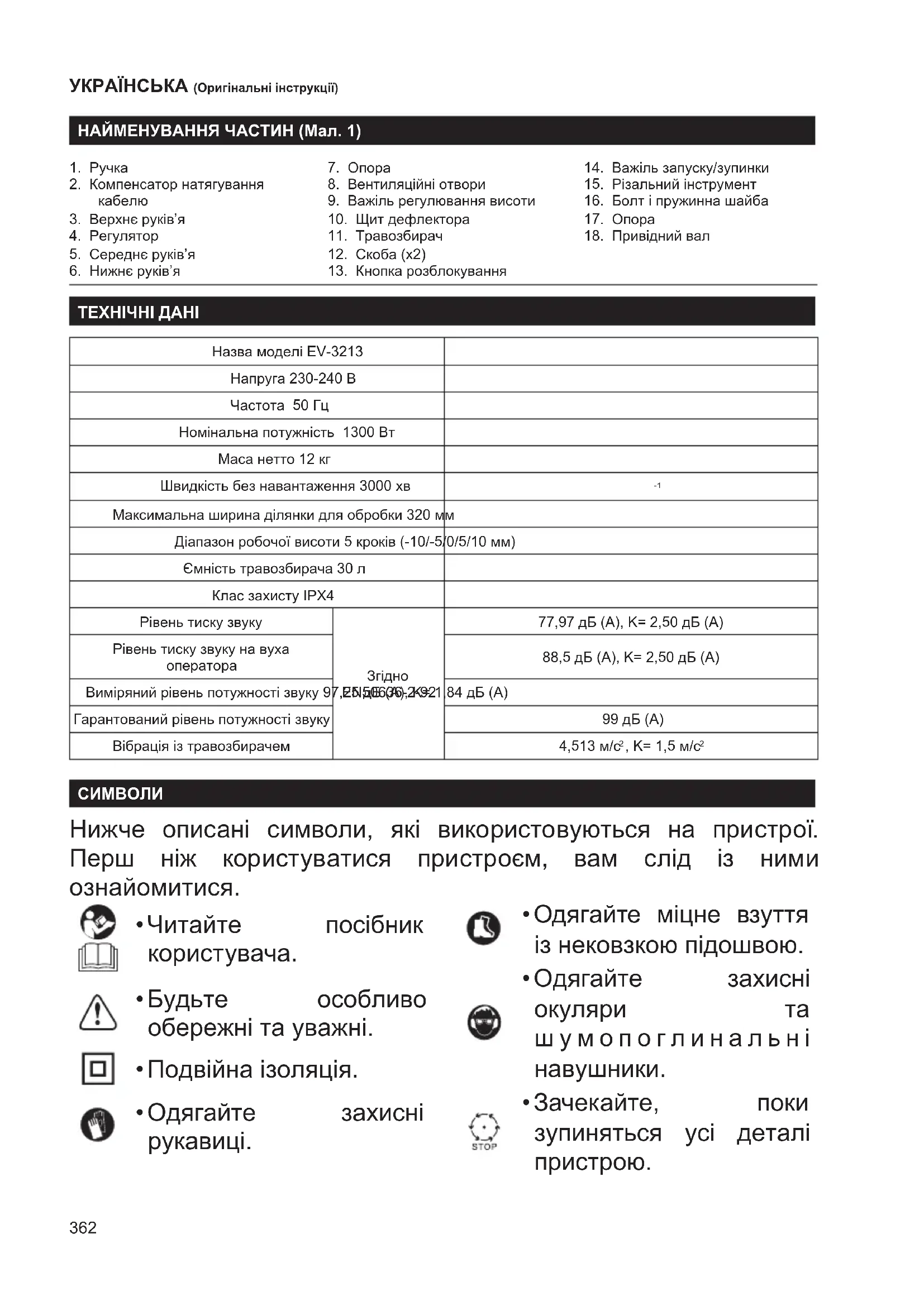 – перевірте, чи щити і захисні компоненти, зокрема дефлектори та травозбирач, функціонують належним чином; – перевірте, чи вентиляційні отвори не засмічені пилюкою чи іншими сторонніми матеріалами; якщо вони заблоковані, прочистьте їх м’якою щіткою або ганчіркою; – зніміть пошкоджені або нечитабельні ярлики; – ретельно перевірте всі компоненти пристрою, щоб визначити, чи він функціонує належним чином; зокрема, не користуйтеся пристроєм, якщо перемикач не працює належним чином; – перемикач має перебувати у положенні вимкнення, щоб запобігти випадковому запуску пристрою; – перевірте, чи всі ремонтні інструменти, такі як регулювальний ключ та гайковий ключ, від’єднано.
