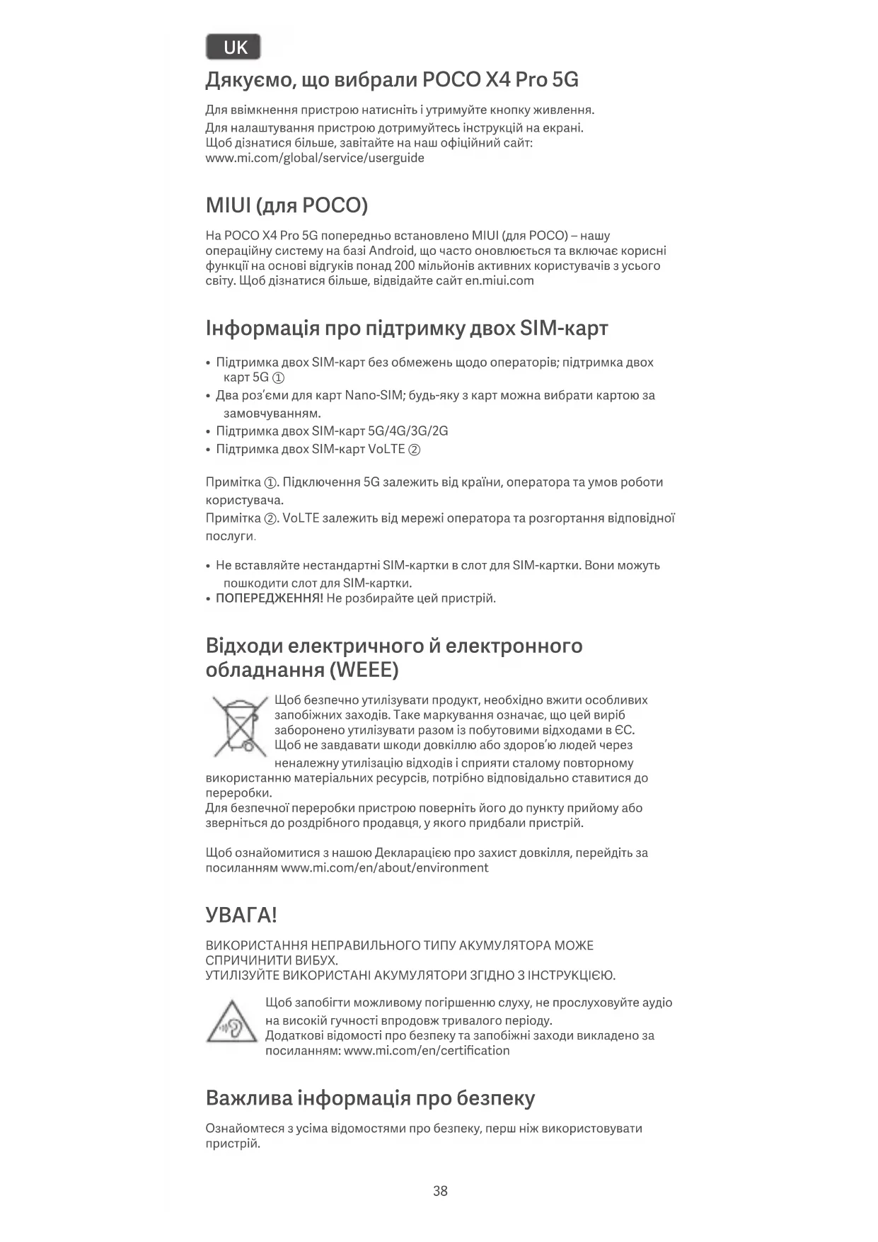 ВИКОРИСТАННЯ НЕПРАВИЛЬНОГО ТИПУ АКУМУЛЯТОРА МОЖЕ СПРИЧИНИТИ ВИБУХ. УТИЛІЗУЙТЕ ВИКОРИСТАНІ АКУМУЛЯТОРИ ЗГІДНО З ІНСТРУКЦІЄЮ. Щоб запобігти можливому погіршенню слуху, не прослуховуйте аудіо на високій гучності впродовж тривалого періоду. Додаткові відомості про безпеку та запобіжні заходи викладено за посиланням: www.mi.com/en/certification Важлива інформація про безпеку Ознайомтеся з усіма відомостями про безпеку, перш ніж використовувати