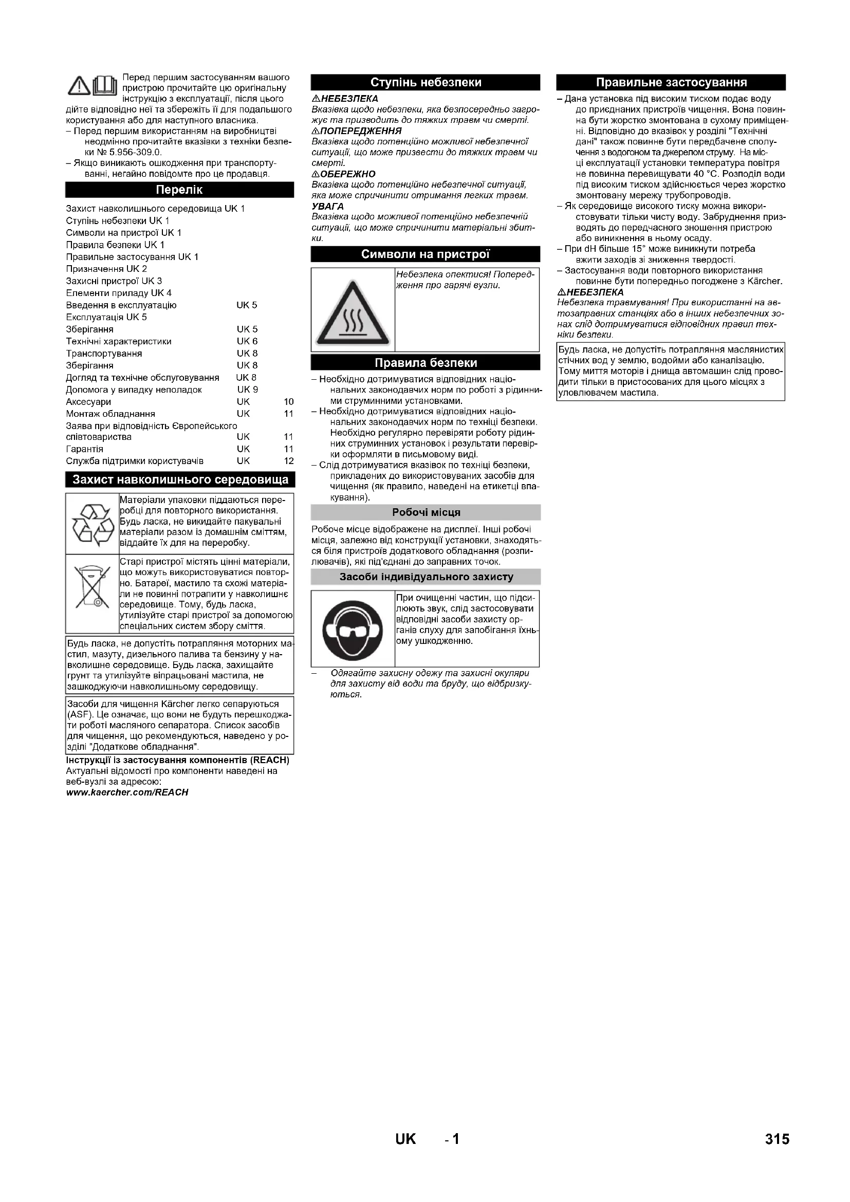 Захист навколишнього середовища UK 1 Ступінь небезпеки UK 1 Символи на пристрої UK 1 Правила безпеки UK 1 Правильне застосування UK 1 Призначення UK 2 Захисні пристрої UK 3 Елементи приладу UK 4 Введення в експлуатацію UK 5 Експлуатація UK 5 Зберігання UK 5 Технічні характеристики UK 6 Транспортування UK 8 Зберігання UK 8 Догляд та технічне обслуговування UK 8 Допомога у випадку неполадок UK 9 Аксесуари UK 10 Монтаж обладнання UK 11 Заява при відповідність Європейського співтовариства UK 11 Гарантія UK 11 Служба підтримки користувачів UK 12 Захист навколишнього середовища Матеріали упаковки піддаються пере- робці для повторного використання. Будь ласка, не викидайте пакувальні матеріали разом із домашнім сміттям, віддайте їх для на переробку. Старі пристрої містять цінні матеріали, що можуть використовуватися повтор- но. Батареї, мастило та схожі матеріа- ли не повинні потрапити у навколишнє середовище. Тому, будь ласка, утилізуйте старі пристрої за допомогою спеціальних систем збору сміття. Будь ласка, не допустіть потрапляння моторних ма- стил, мазуту, дизельного палива та бензину у на- вколишне середовище. Будь ласка, захищайте грунт та утилізуйте віпрацьовані мастила, не зашкоджуючи навколишньому середовищу. Засоби для чищення Kärcher легко сепаруються (ASF). Це означає, що вони не будуть перешкоджа- ти роботі масляного сепаратора. Список засобів для чищення, що рекомендуються, наведено у ро- зділі "Додаткове обладнання". Ступінь небезпеки Символи на пристрої Небезпека опектися! Поперед- ження про гарячі вузли. Правила безпеки Робочі місця Засоби індивідуального захисту При очищенні частин, що підси- люють звук, слід застосовувати відповідні засоби захисту ор- ганів слуху для запобігання їхнь- ому ушкодженню. Правильне застосування Будь ласка, не допустіть потрапляння маслянистих стічних вод у землю, водойми або каналізацію. Тому миття моторів і днища автомашин слід прово- дити тільки в пристосованих для цього місцях з уловлювачем мастила. 315UK- 2 1 Шлямовловлювач (на установці) 2 Датчик температури 3 Система запобігання у разі відсутності води 4 Поплавкова камера 5 Насос попереднього тиску