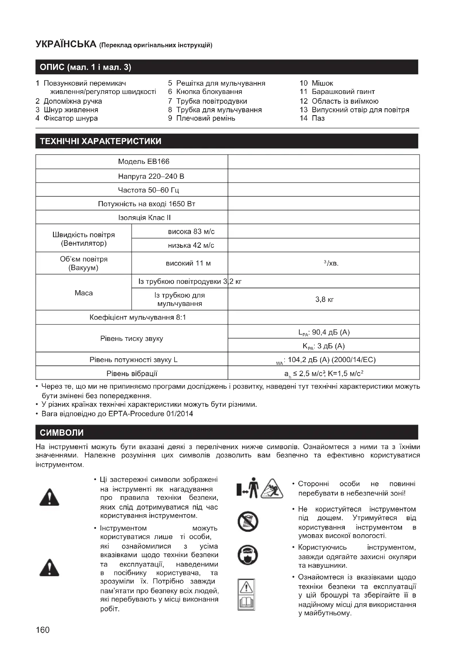 цепи и при необходимости заново установите. СЕРТИФИКАТ СООТВЕТСТВИЯ ЕС Только для европейских стран Сертификат соответствия ЕС внесен как Приложение A к данной инструкции по эксплуатации.160 УКРАЇНСЬКА (Переклад оригінальних інструкцій) ОПИС (мал. 1 і мал. 3) 1 Повзунковий перемикач живлення/регулятор швидкості 2 Допоміжна ручка 3 Шнур живлення 4 Фіксатор шнура 5 Решітка для мульчування 6 Кнопка блокування 7 Трубка повітродувки 8 Трубка для мульчування 9 Плечовий ремінь 10 Мішок 11 Барашковий гвинт 12 Область із виїмкою 13 Випускний отвір для повітря 14 Паз ТЕХНІЧНІ ХАРАКТЕРИСТИКИ Модель EB166 Напруга 220–240 В Частота 50–60 Гц Потужність на вході 1650 Вт Ізоляція Клас ІІ Швидкість повітря (Вентилятор) висока 83 м/с низька 42 м/с Об’єм повітря