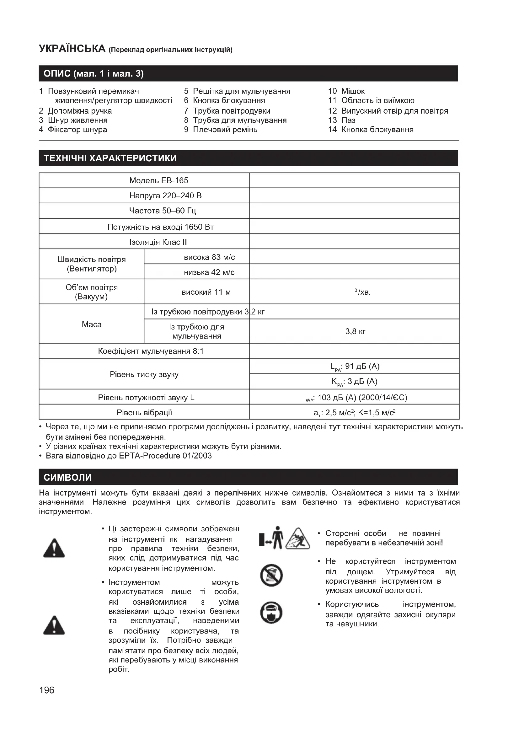 Допоміжна ручка 3 Шнур живлення 4 Фіксатор шнура 5 Решітка для мульчування 6 Кнопка блокування 7 Трубка повітродувки 8 Трубка для мульчування 9 Плечовий ремінь 10 Мішок 11 Область із виїмкою 12 Випускний отвір для повітря 13 Паз 14 Кнопка блокування ТЕХНІЧНІ ХАРАКТЕРИСТИКИ Модель EB-165 Напруга 220–240 В Частота 50–60 Гц Потужність на вході 1650 Вт Ізоляція Клас ІІ Швидкість повітря (Вентилятор) висока 83 м/с низька 42 м/с Об’єм повітря