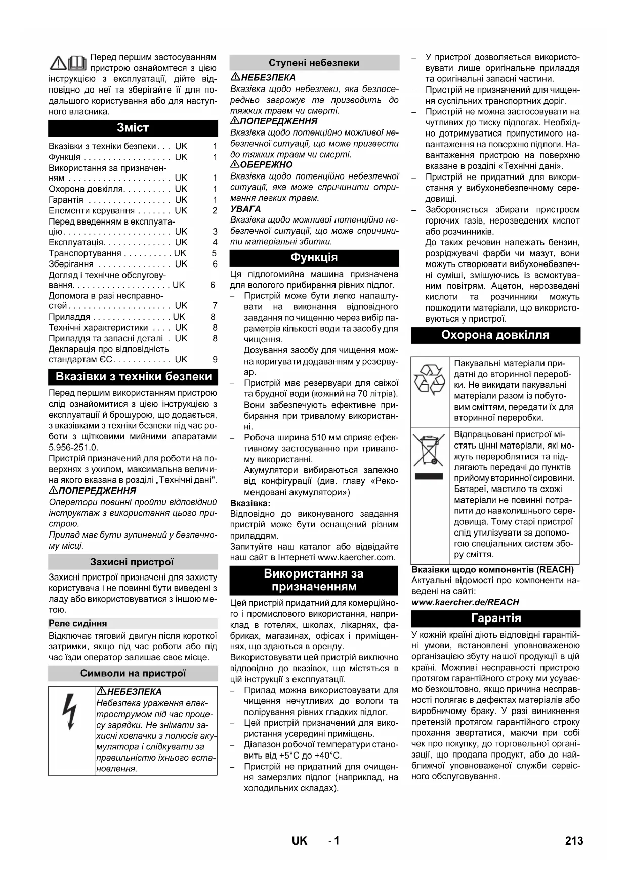 www.kaercher.de/REACH У кожній країні діють відповідні гарантій- ні умови, встановлені уповноваженою організацією збуту нашої продукції в цій країні. Можливі несправності пристрою протягом гарантійного строку ми усуває- мо безкоштовно, якщо причина несправ- ності полягає в дефектах матеріалів або виробничому браку. У разі виникнення претензій протягом гарантійного строку прохання звертатися, маючи