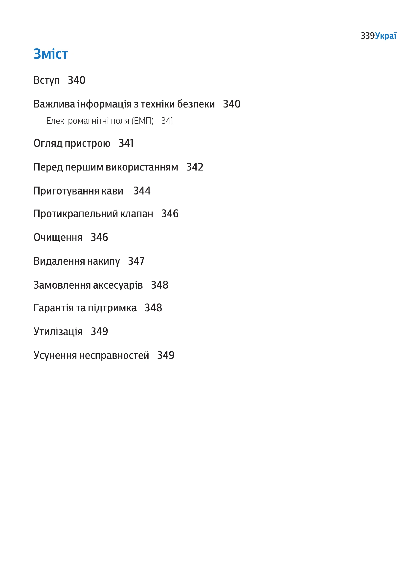 - Om du tar bort kannan från apparaten under mer än 20 sekunder vid bryggningen kommer lterhållaren att svämma över. 338 SvenskaЗміст Вступ 340 Важлива інформація з техніки безпеки 340 Електромагнітні поля (ЕМП) 341 Огляд пристрою 341 Перед першим використанням 342 Приготування кави 344 Протикрапельний клапан 346 Очищення 346 Видалення накипу 347 Замовлення аксесуарів 348 Гарантія та підтримка 348 Утилізація 349 Усунення несправностей 349 339УкраїнськаВступ Вітаємо вас із покупкою та ласкаво просимо до клубу Philips! Щоб уповні скористатися підтримкою, яку пропонує Philips, зареєструйте свій виріб на веб-сайті www.philips.com/welcome. Важлива інформація з техніки безпеки Перш ніж користуватися пристроєм, уважно прочитайте цю важливу інформацію та зберігайте її для довідки в майбутньому.